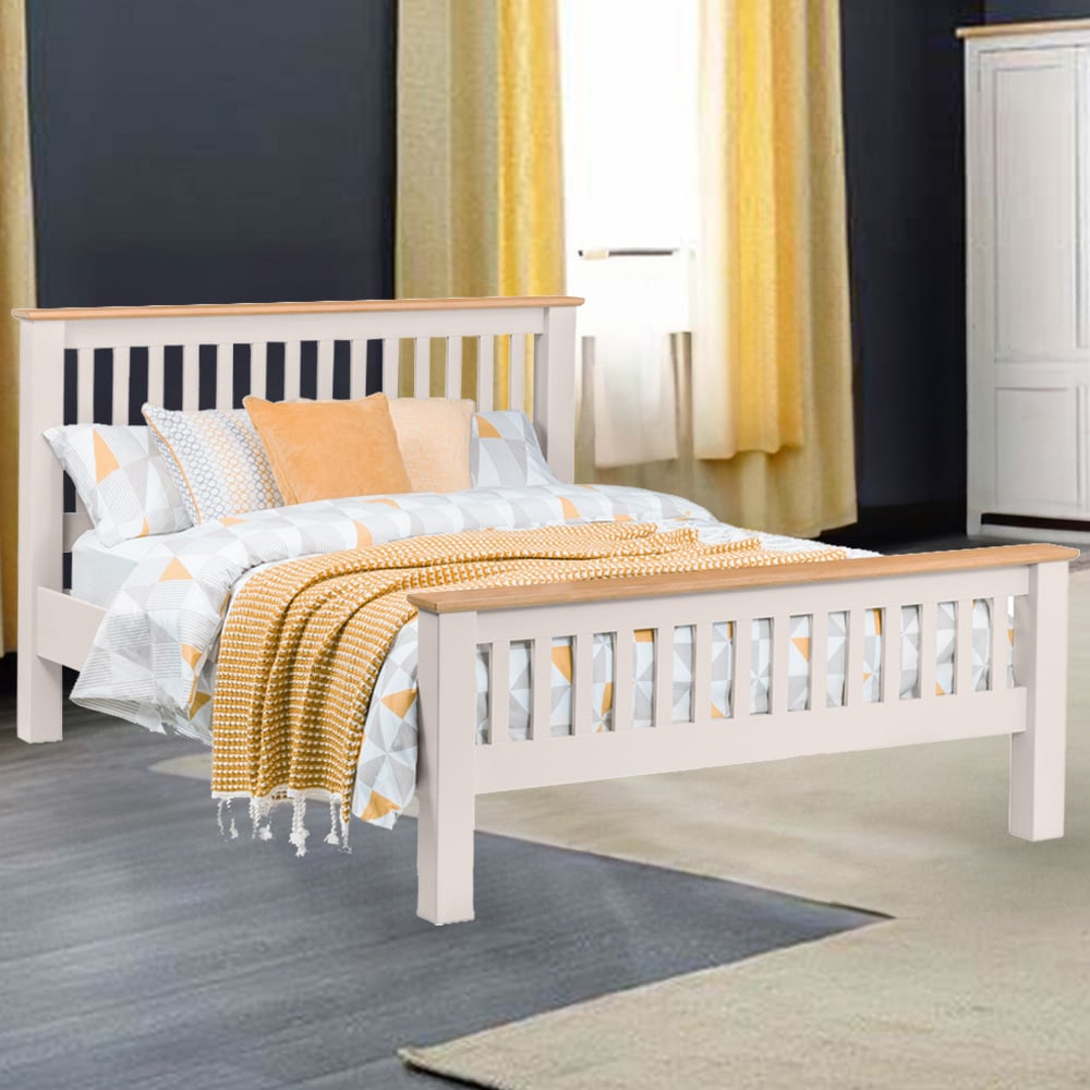 Elevate your bedroom with the Richmond double bed frame. Its imposing shaker style, finished in a sophisticated elephant grey lacquer, offers timeless elegance to suit any décor. Crafted from white oak and oak veneers, this lacquered bed frame beautifully blends modern aesthetics with traditional construction. A statement piece that effortlessly combines style, practicality, and lasting quality. It features a high foot end.