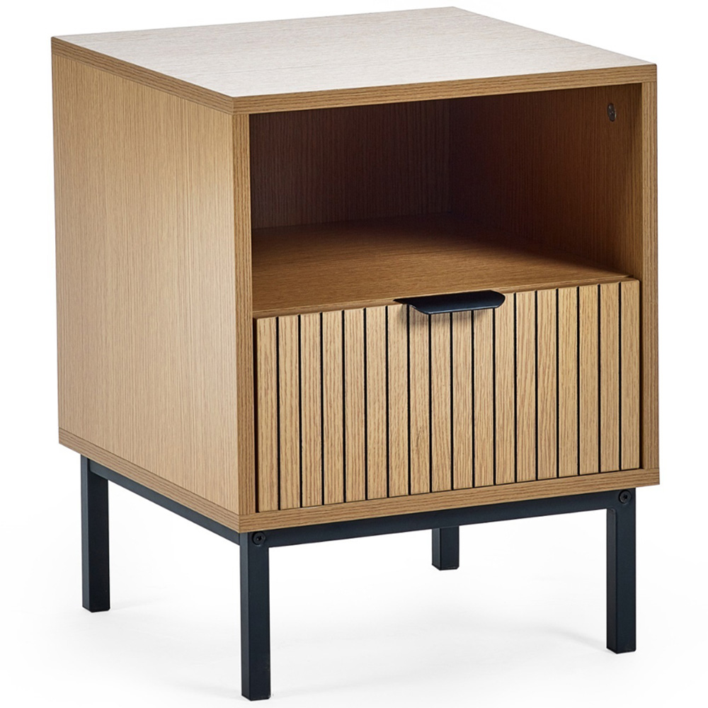Add a touch of warmth and practicality to your living room or bedroom with the Sia side table. Its compact design, featuring a smooth wooden top and stylish slatted detailing, is perfect for smaller spaces. The open lower shelf provides ideal display space for books or decorative items, while a convenient drawer with a sleek black handle offers discreet storage for smaller essentials. Finished with sturdy black metal legs for a modern feel, this side table blends style and functionality effortlessly. Simple assembly ensures it's ready to enhance your home in no time.