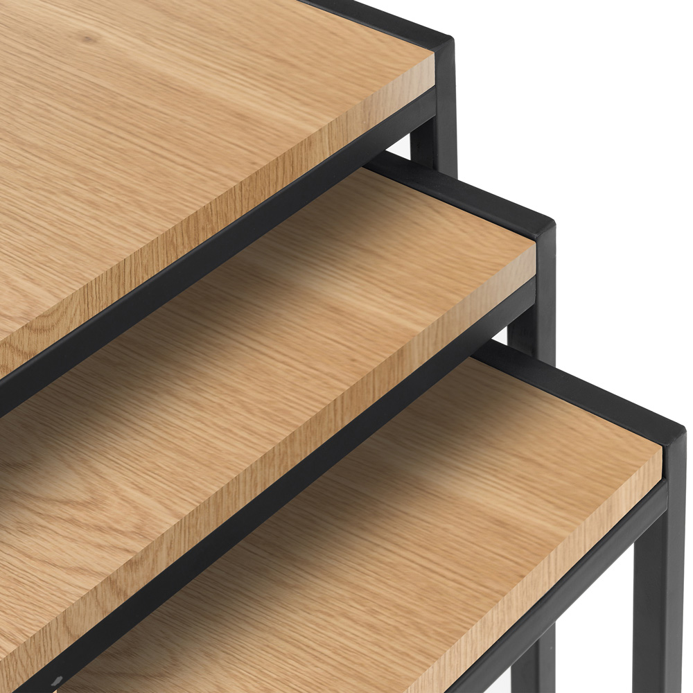 The Tribeca nest of tables brings contemporary style to any space. Three tables, each with simple, clean lines and a subtle black coated metal frame, are complemented by a stunning Euro Oak foil finish, creating a sleek and sophisticated look. Simple yet practical, this set makes a stylish addition to your home or office.