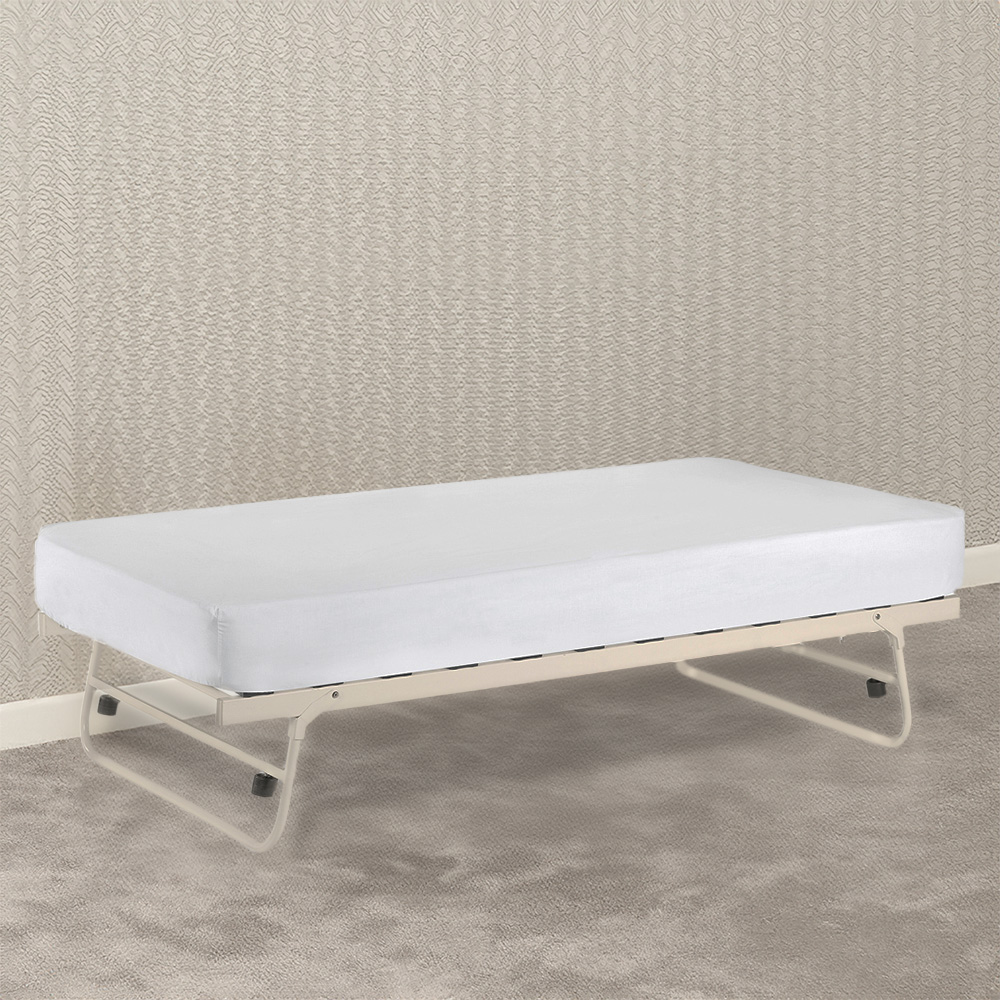 Enhance your bedroom with the beautifully crafted Julian Bowen Versailles White Single Underbed Trundle, a perfect addition for those who wish to maximise space and elegance. Designed to slide smoothly under the Versailles Day bed, this trundle effortlessly pulls out on wheels and can be elevated to create a generous king-size sleeping area when needed. The classic white finish, along with intricate railings and finials, brings sophistication to any room, making it ideal for children's bedrooms or guest accommodations. Crafted from high-quality materials, this trundle ensures durability and stability for everyday use. Suitable for standard single mattresses (sold separately), this product is designed with practicality in mind. The purchase includes one stunning daybed with a trundle, and you only need to add feet for assembly.