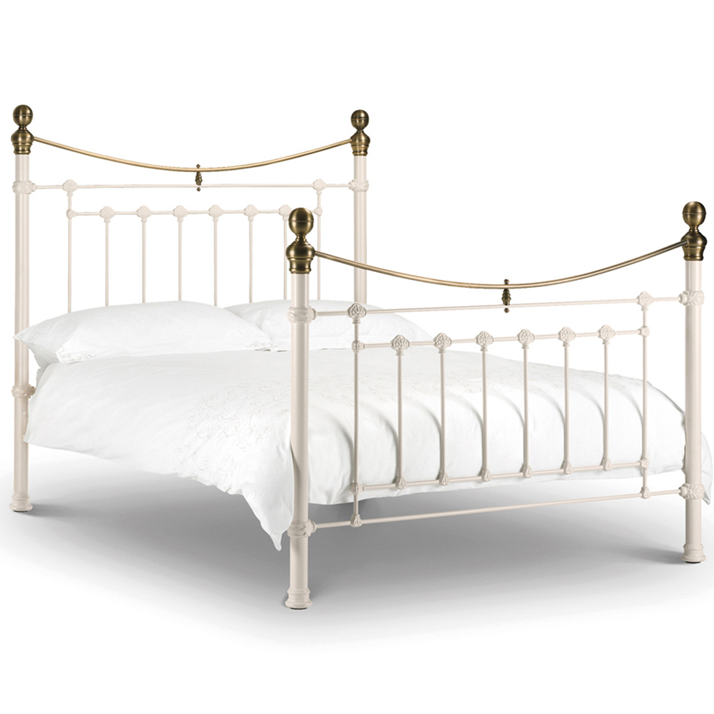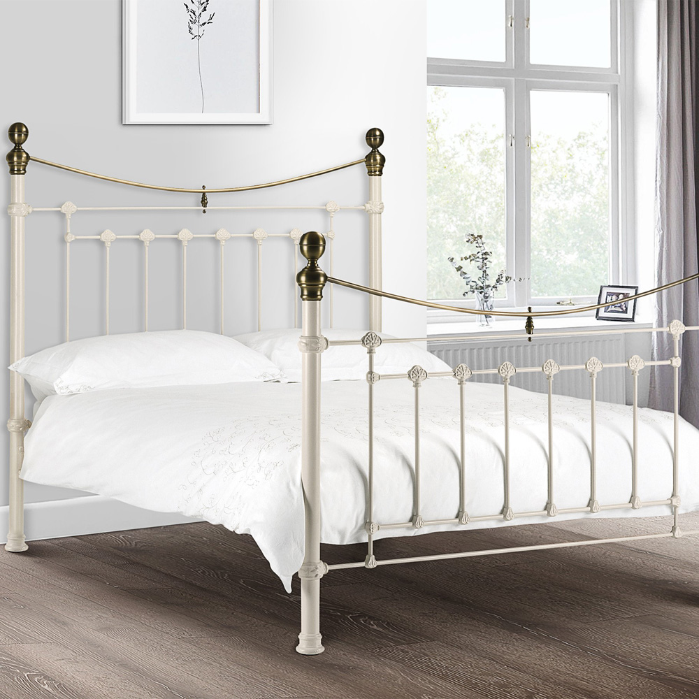 Elevate your bedroom with the timeless elegance of the Victoria bed. This double bed boasts a striking Victorian design, featuring a high headboard and matching footboard, both beautifully detailed with brass accents and finished in a sophisticated stone white powder-coated steel. Its imposing presence complements diverse interior styles, while the sprung slatted base promises both comfort and extended mattress lifespan. A truly luxurious addition to any bedroom.