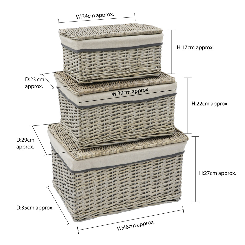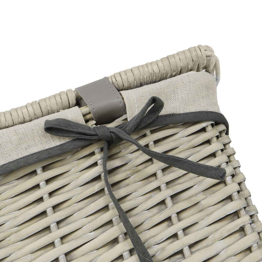 Add a touch of rustic charm and effortless organisation to your home with this three-piece Arianna Grey Rectangular Hamper set. Handwoven from willow with an antique wash finish, these durable baskets blend seamlessly with various interior styles. Ideal for bathrooms, bedrooms, laundry rooms, or utility spaces, they offer practical storage solutions for a range of items. Each basket features a removable liner for easy cleaning. The set includes a large (H27 x W46 x D35cm, approx. 43L capacity), medium (H22 x W39 x D29cm, approx. 25L capacity), and small basket (H17 x W34 x D23cm, approx. 13L capacity). Crafted from renewable materials by skilled artisans using raw fibres, these baskets are as beautiful as they are functional.