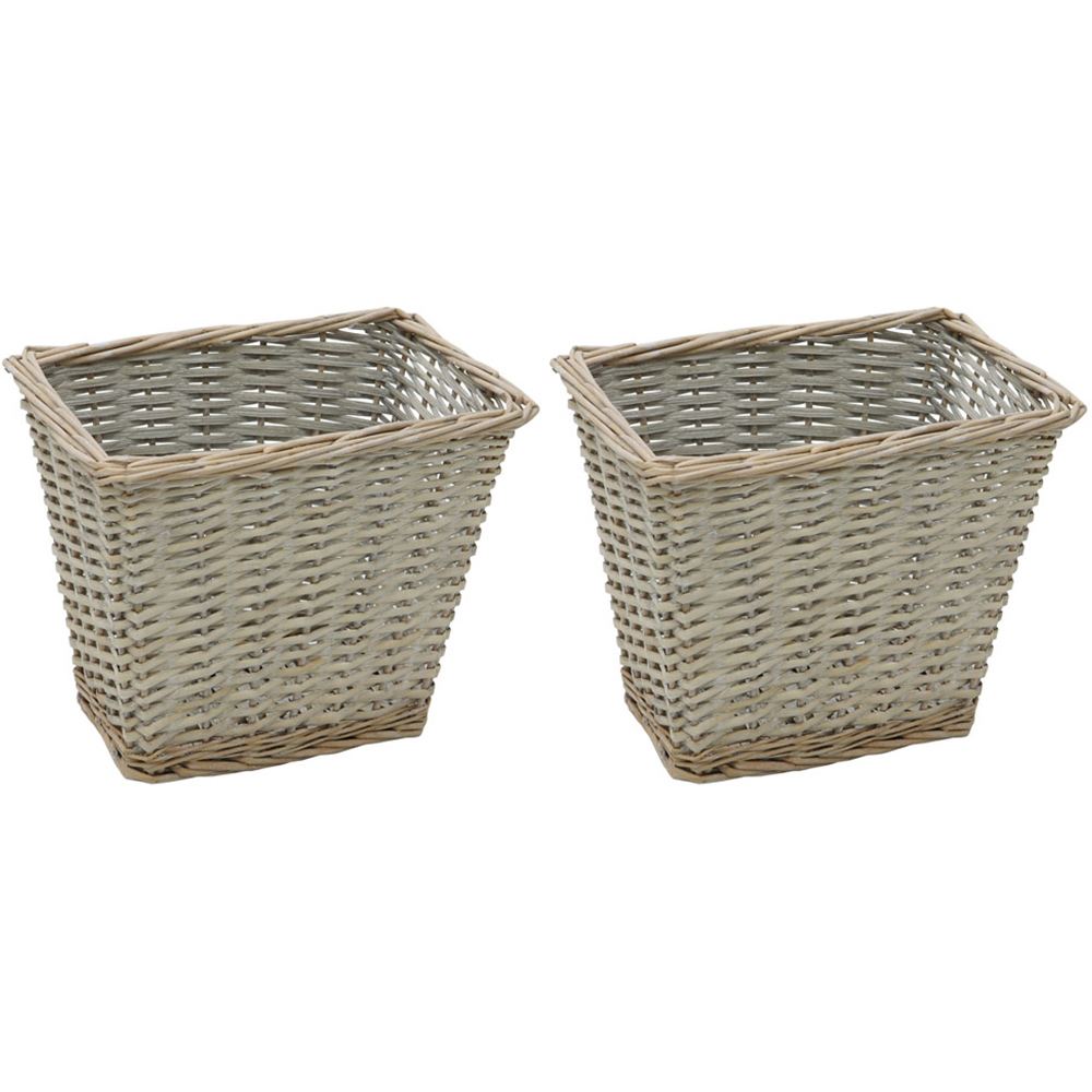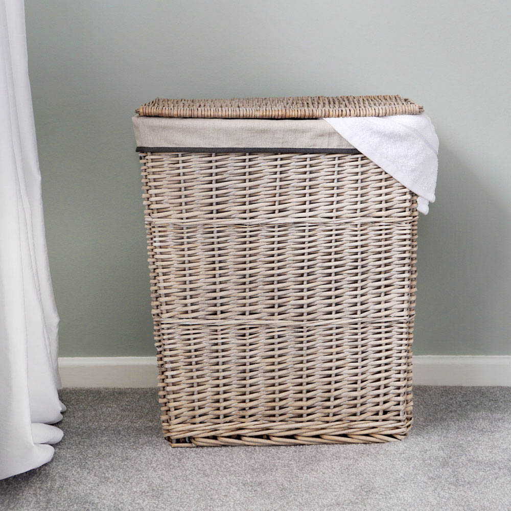 Effortlessly manage your laundry with this stylish set of four willow laundry baskets. Handwoven from natural willow with an antique-washed grey finish, this set offers a charming, rustic touch to any room. The rectangular design includes two sizes of laundry baskets – a large (H57 x W45 x D32cm, approx. 78L capacity) and a medium (H48 x W38 x D25cm, approx. 43L capacity) – plus two smaller bins (H25 x W30 x D20cm, approx. 11L capacity each). Each basket features a lid to keep contents concealed, and the strong, durable weave ensures lasting use. Made using renewable materials. Perfect for bedrooms, bathrooms, or laundry rooms.