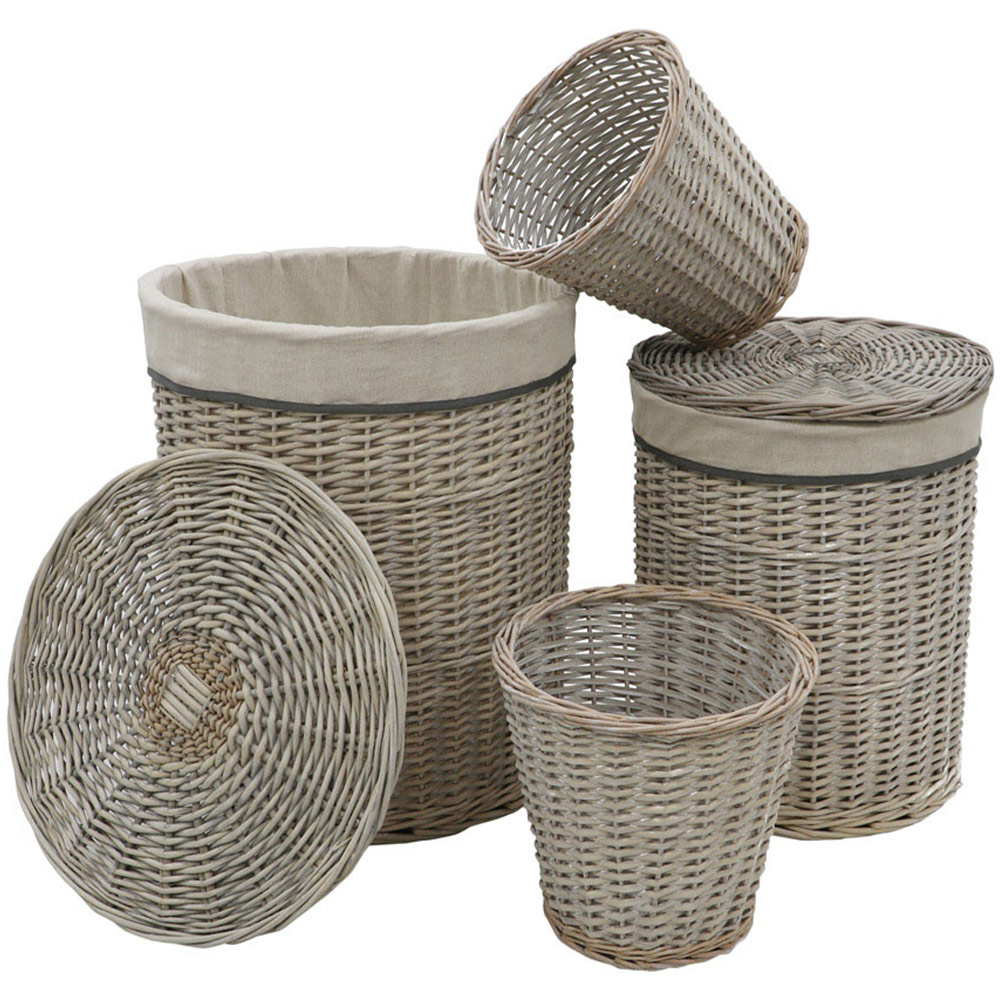 JVL 4 Piece Arianna Grey Round Willow Laundry and Waste Paper Basket Set