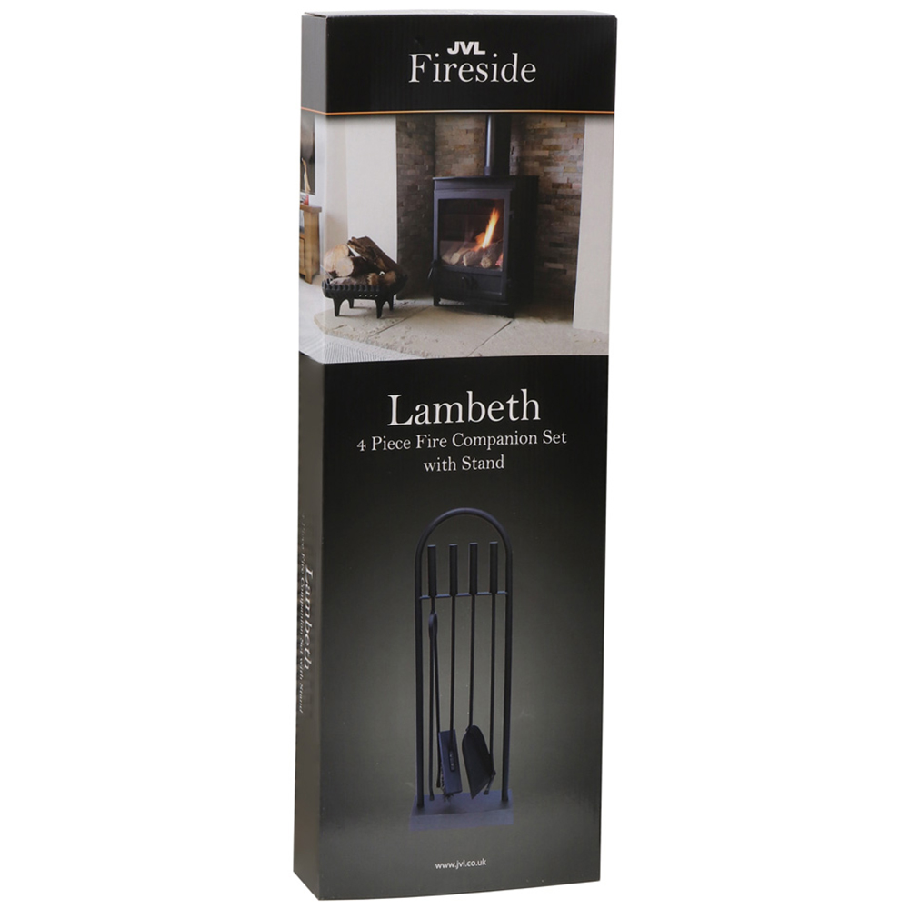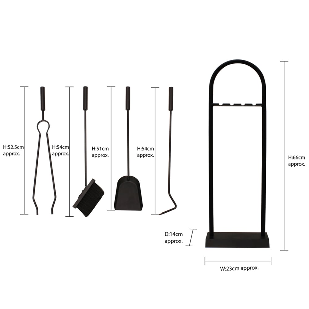 Enhance your fireplace with the Lambeth Companion Fireside Set. This four-piece set includes all the essential tools: shovel, brush, tongs, and poker, for easy fireplace maintenance. Keep your fire burning efficiently with the poker, sweep away ash with the brush, use the tongs for hot coals, and the shovel for cooled ashes. The set',s robust steel construction, finished with a sleek black powder coat, guarantees lasting durability. The tools hang elegantly from an arched frame supported by a wide rectangular base. Its contemporary design suits both modern and traditional fireplaces, and the comfortably designed handles make cleaning effortless. A simple wipe with a damp cloth keeps it looking its best. Approx size: H66 x W23 x D14cm.