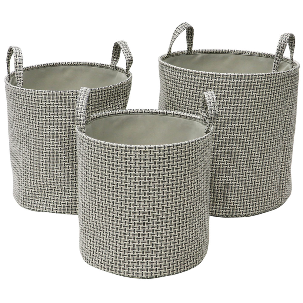 Elevate your home organisation with the JVL Silva Set of three Round Fabric Storage Baskets. Crafted from a striking basket weave fabric in soothing muted grey tones, this collection beautifully embodies a woven heritage that complements any interior decor. Each basket showcases a unique dog tooth effect, adding a touch of sophistication to your space. These versatile baskets are perfect for storing a variety of items, from small garments and jewellery to toys, towels, and baby products. Whether placed in a bedroom, living room, playroom, or utility room, they serve as stylish open storage solutions that enhance your décor while keeping your belongings neatly tucked away. Their attractive design makes them ideal for open units and wardrobes, and they can effortlessly double as decorative accents throughout your home. Practicality meets elegance with convenient handles that allow for easy transportation, and when not in use, these baskets can be nested together for efficient storage. The dimensions are as follows: Large: H38 x W38 x D38cm approx. Capacity: 54.5L approx., Medium: H34 x W34 x D34cm approx. Capacity: 39L approx., and Small: H30 x W30 x D30cm approx. Capacity: 27L approx. Embrace organisation with a touch of style with the Silva storage collection.