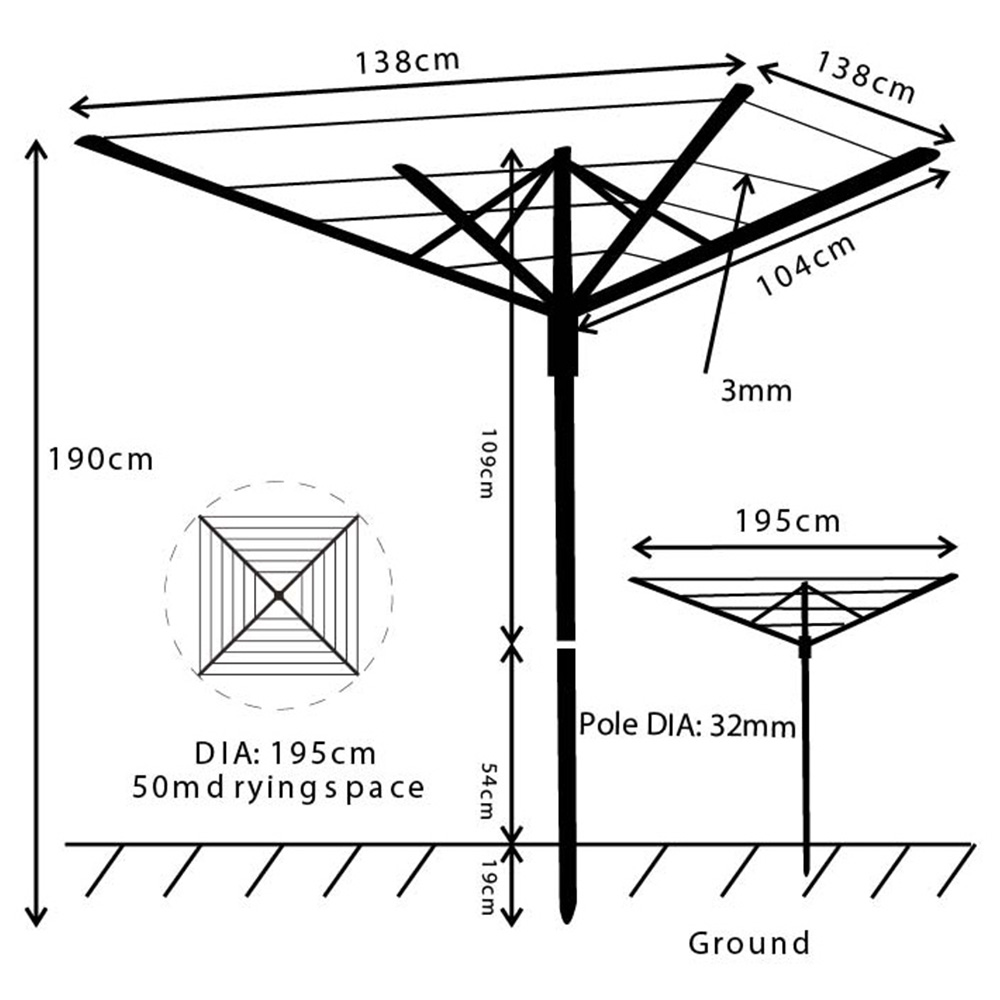 Effortlessly dry your laundry with the JVL Slate Grey Rotary Airer. This portable, four-arm airer offers a generous 50m of drying space, eliminating the need for cumbersome clotheslines. Its user-friendly umbrella locking system keeps lines taut and arms securely in place, supporting up to 40kg of laundry. Constructed with a robust steel frame and featuring a ground socket for secure outdoor use, this airer is fully collapsible for convenient storage when not in use.