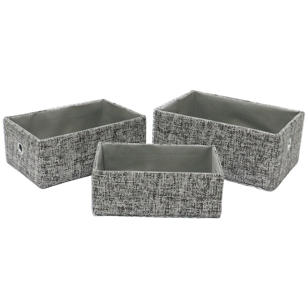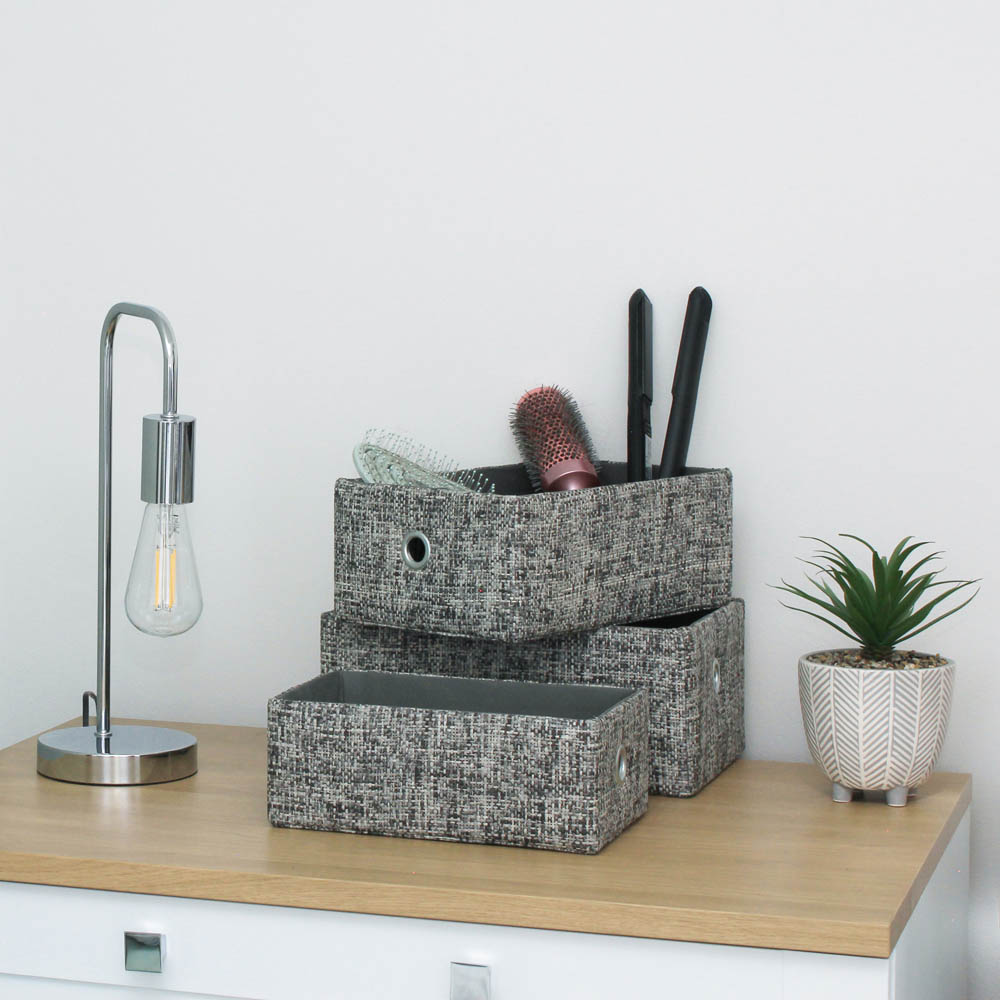 Introducing the JVL Urban Set of Three Rectangular Paper Storage Baskets, the perfect blend of style and functionality for your modern living space. Crafted from a textured inner-city fabric, these baskets effortlessly enhance the aesthetic of any contemporary home, loft, or city apartment. The elegant two-tone textured grey finish complements a variety of interiors, making them a versatile addition to your decor. These chic storage solutions are ideal for decluttering your home, whether you’re organising jewellery, toiletries, stationery, or clothing. Use them to keep your drawers tidy or display them as decorative accents throughout your home. When not in use, these baskets conveniently nest inside one another, ensuring you save space. Designed with practicality in mind, each basket features sturdy metal handles for easy transport. The dimensions are perfectly tailored for your needs: Large: H14 x W32 x D22cm, Medium: H12 x W29 x D19cm, and Small: H10 x W26 x D16cm. Elevate your storage game with the JVL Urban Set and enjoy a clutter-free, stylish environment.