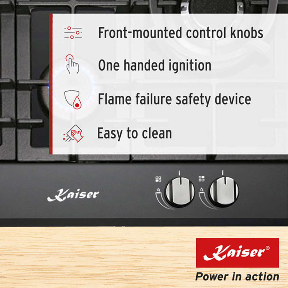 This stylish black gas hob is ready to bring some shine to your kitchen. Featuring four burners, including a powerful turbo burner and a large burner for high-heat cooking. The clever layout gives you extra space for all your pots and pans, and the sleek glass surface makes cleaning effortless. The robust cast iron supports are even dishwasher-safe, and a wok adapter is included, perfect for creating tasty stir-fries. Complete with a safety shut-off feature and easy-to-use front controls, it’s a great choice for busy homes.