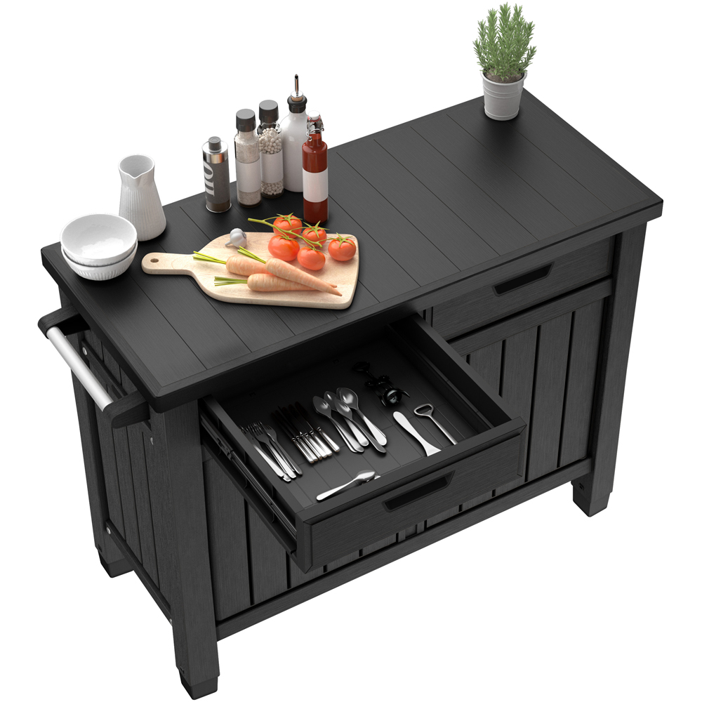 A durable, all-weather resin prep station and serving area. Features smooth-running ball-bearing drawer slides for ample storage. Finished with an attractive wood-effect texture.