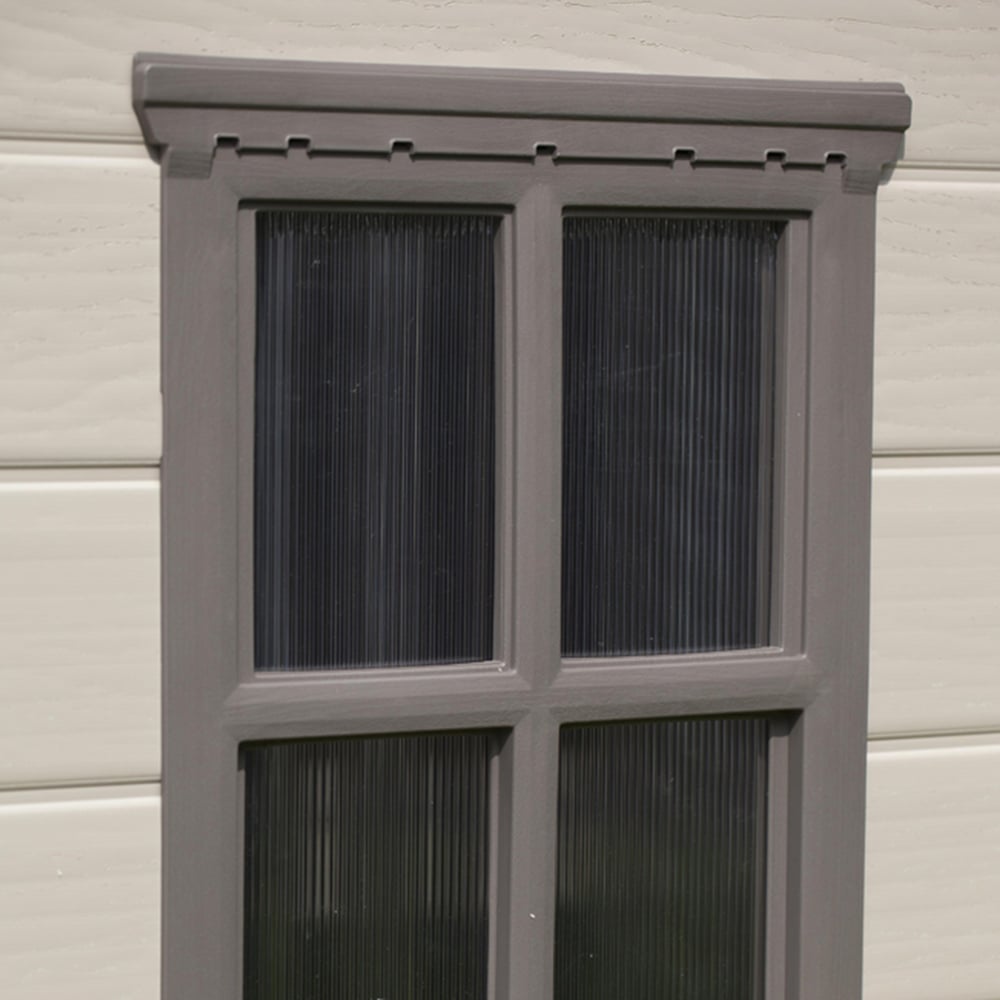 Store your garden furniture, BBQ, bicycles, tools, and accessories with ease in this stylish 8 x 6ft garden shed. Crafted from durable, weather-resistant resin with steel reinforcement and heavy-duty flooring, this shed offers lasting protection against the elements. The elegant wood-look design complements any garden setting. Features include wide double doors (with a lockable option), a window and skylight, a high ceiling, two shelves, and built-in ventilation. Easy to assemble, this shed boasts external dimensions of H243 x W256.6 x L182cm and internal dimensions of H238.5 x W236.5 x L162cm.