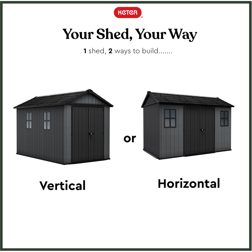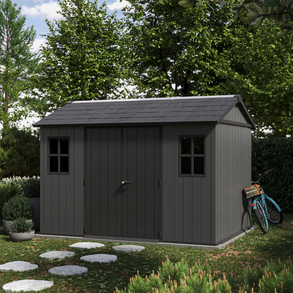 Upgrade your garden storage with the stylish and robust Keter Newton Plus 7.5 x 11ft Grey Steel Double Wall Shed. Built to withstand even the harshest weather, this shed boasts a double-wall construction and steel reinforcements for lasting durability. Its modern Evotech panels offer the beauty of wood without the maintenance—no rotting, rusting, denting, or peeling. Enjoy the convenience of a heavy-duty floor, protecting your equipment from moisture. The versatile design allows for two configurations: a spacious 7.5 x 11ft layout or a narrower 11 x 7.5ft option, adapting to your garden's unique dimensions. Victorian-style windows, a full-length skylight, and built-in ventilation create a bright and airy interior. Secure your valuable items with lockable double doors, perfect for storing ride-on lawnmowers and heavy-duty tools.