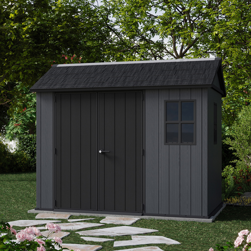 Enhance your outdoor space with the versatile Keter Newton Plus shed, a robust storage solution designed for lasting performance. Its steel-reinforced, double-wall construction ensures resilience against harsh weather conditions. This innovative 7.5 x 9ft shed offers a modular design, adaptable to your needs as either a 7.5 x 9ft or 9 x 7.5ft configuration. Enjoy the charm of Victorian-style windows, complemented by a full-length skylight and built-in ventilation for a bright and airy interior. A heavy-duty floor protects your belongings from moisture, while Evotech panels provide the aesthetic appeal of wood without the upkeep, resisting rust, rot, dents, and peeling.