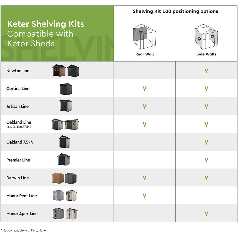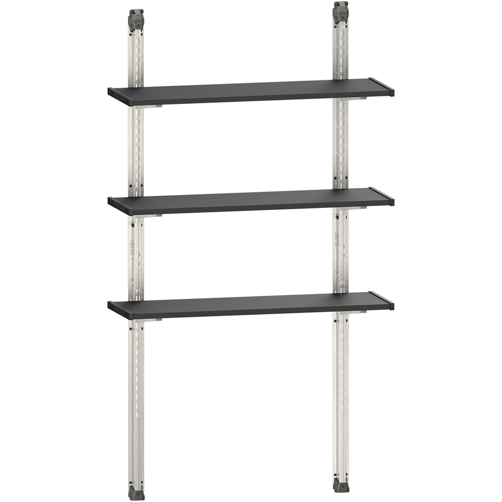 Maximise your shed',s storage potential with this Keter Silver Shelving Kit. This kit provides three robust, adjustable shelves, each reinforced with metal and supported by steel brackets, capable of holding up to 30kg. Measuring 97cm in length, they offer a quick and secure wall-mounting solution for any Keter shed (excluding Factor range), freeing up valuable floor space for larger items. Overall dimensions: 100cm.