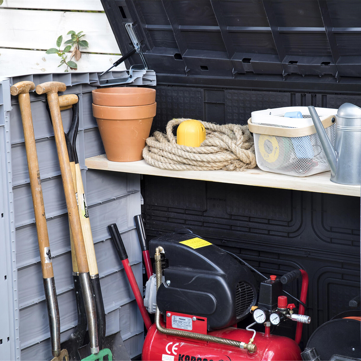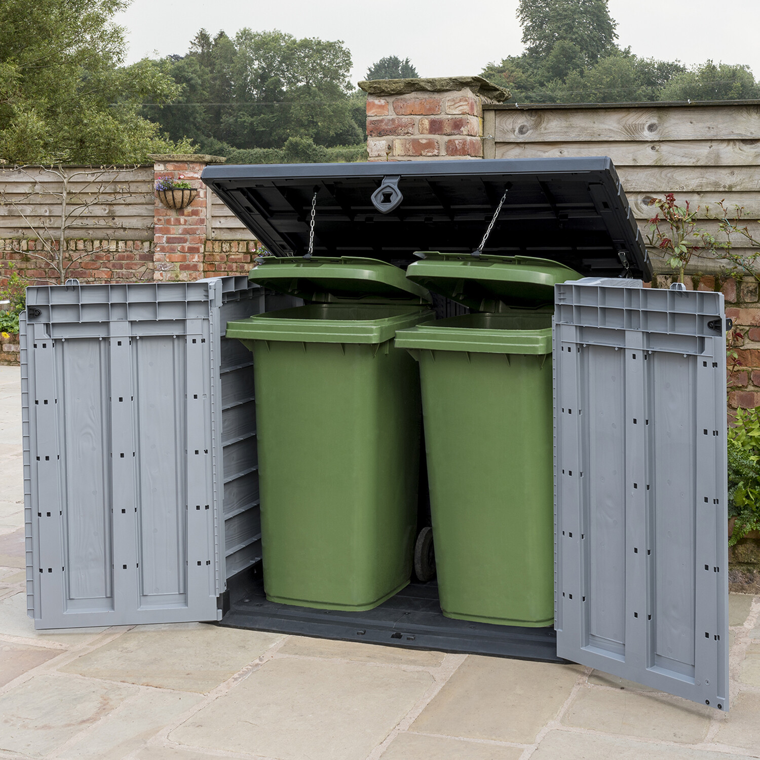 Find the ultimate outdoor storage solution with the Keter Store It Out Ace Garden Store. This storage offers a spacious 1200L capacity in a compact and stylish design. Crafted from durable, weather-resistant, and fade-free resin, it ensures your garden tools, equipment, and bins stay dry and protected all year. With its elegant wood-effect panels and piston-assisted pent lid, this store not only enhances your outdoor space but also provides smart, user-friendly features. Designed with functionality in mind, the storage opens from both the top and the front via lockable double doors. The sloped threshold and wide access make it easy to roll in heavy items, like wheelie bins or garden tools. Moreover, it fits two 240L wheelie bins, keeping your garden or driveway tidy.