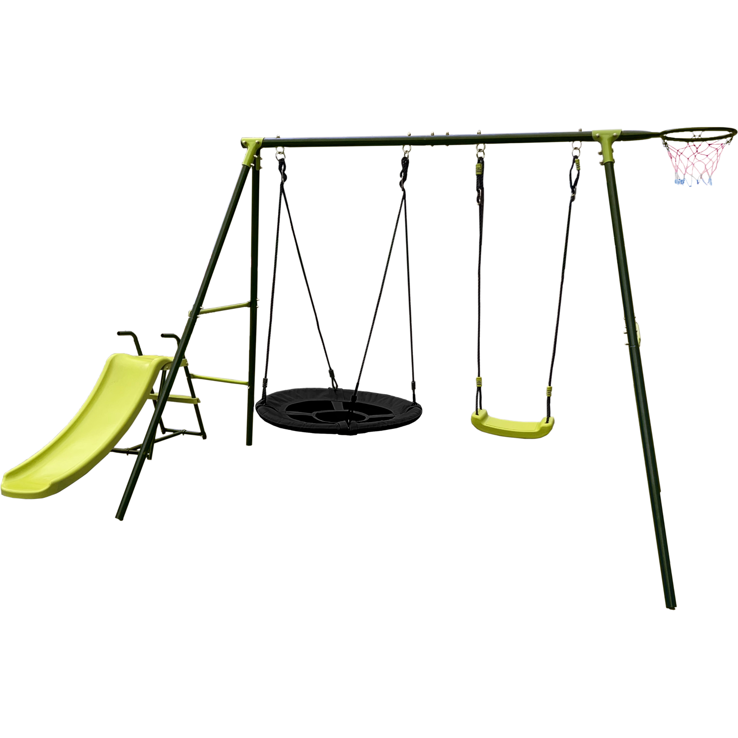 Maximise outdoor fun with this multi-functional playset, designed to keep up to four children entertained simultaneously. Featuring a slide for speedy descents, a classic U-shaped swing, a trendy saucer swing, and even a basketball hoop for budding athletes, this set offers a variety of activities to suit different preferences. Both swings come equipped with adjustable ropes, ensuring a comfortable fit as your children grow. Encourage healthy, active play in the great outdoors with this superb garden gift, perfect for creating lasting childhood memories.