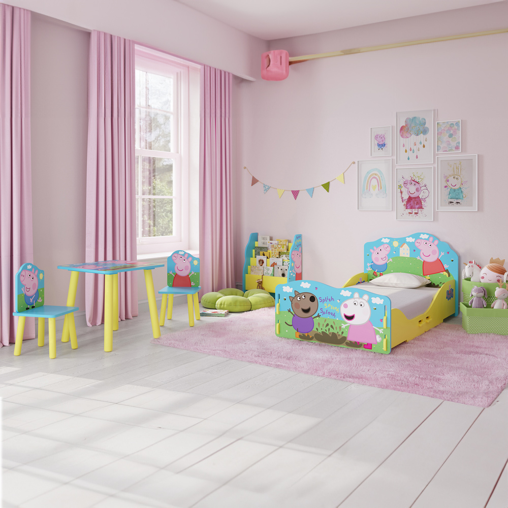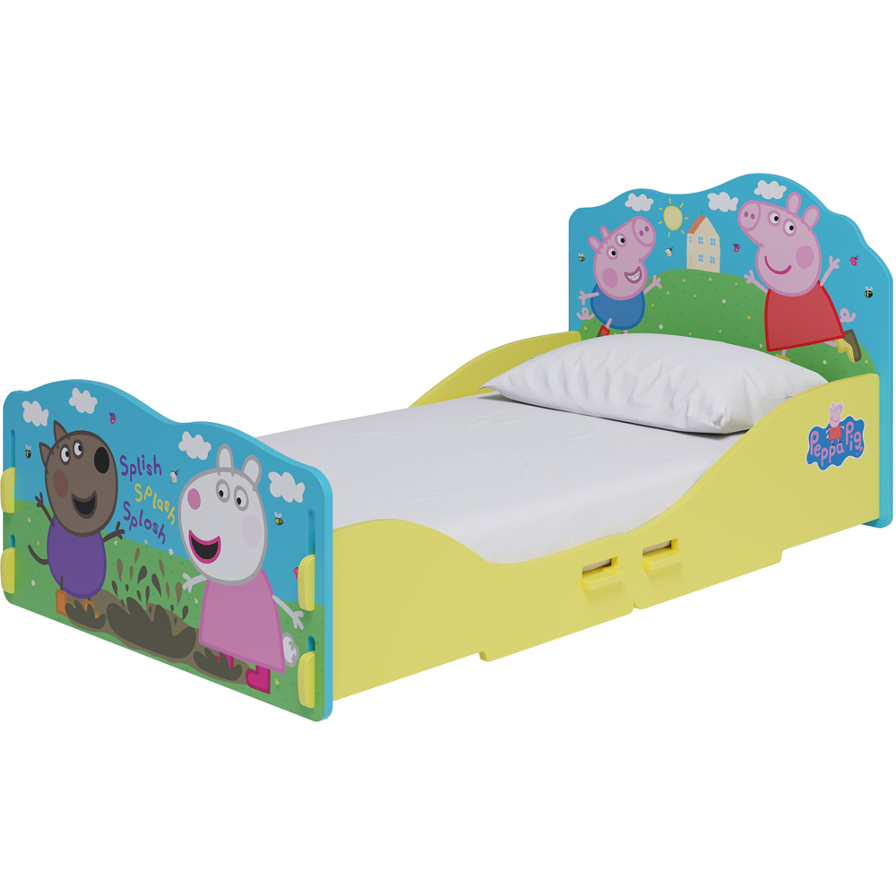 This charming Peppa Pig toddler bed will transform bedtime into an adventure! Featuring Peppa, George and their friends in a bright, colourful design, it's the perfect choice for any young fan. The bed's sturdy construction is easy to assemble—simply slot together and secure the base with a few screws—creating a safe and fun sleeping space. Designed for children moving on from a cot.This Peppa Pig toddler bed takes a mattress size of 140cm x 70cm, it is the perfect addition to any Peppa Pig fan's bedroom!