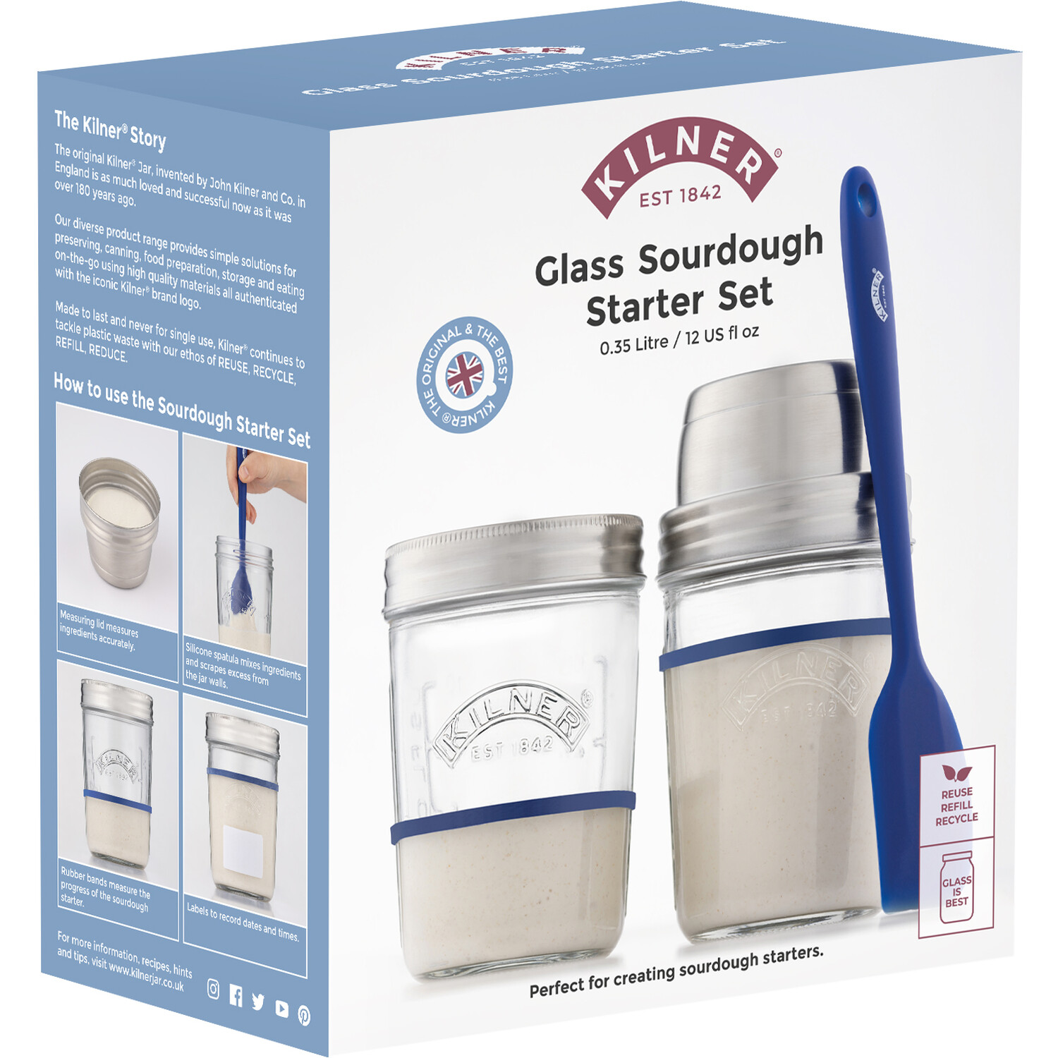 Everything you need to nurture a thriving sourdough starter is included in this Kilner set, paving the way for baking your own fresh, delicious sourdough loaf. Beyond bread, unlock the potential to create pancakes, pizzas, naan breads, and a variety of other baked delights. The set features two jars, enabling you to prepare a second batch whilst the first is being used. The stainless steel measuring lid is specifically designed for accurate flour and water measurements, ensuring it's easy to maintain a successful starter.