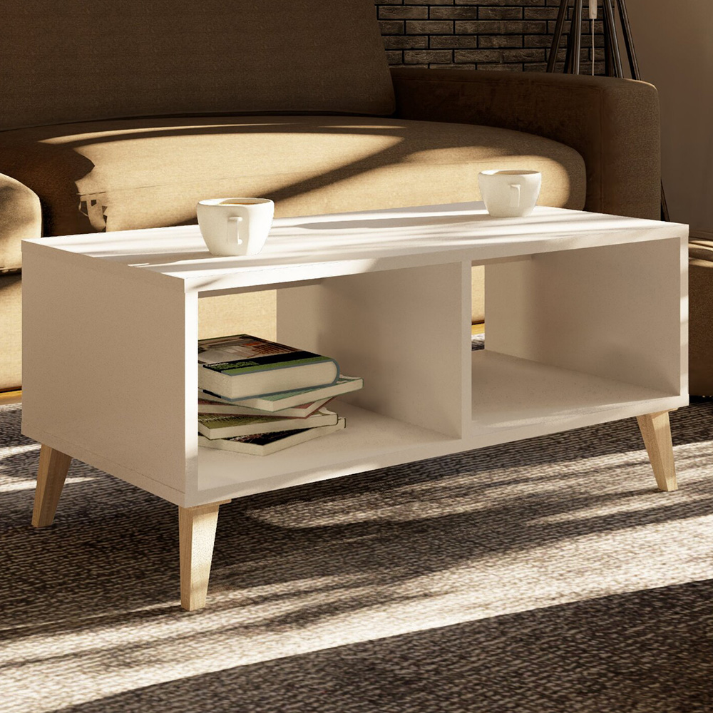 The Kingston coffee table: a stylish and practical addition to your living room. Its contemporary white finish effortlessly complements any décor, while cleverly integrated shelving offers generous storage for books, remotes, and other essentials. A perfect focal point for your lounge, combining modern aesthetics with convenient functionality.