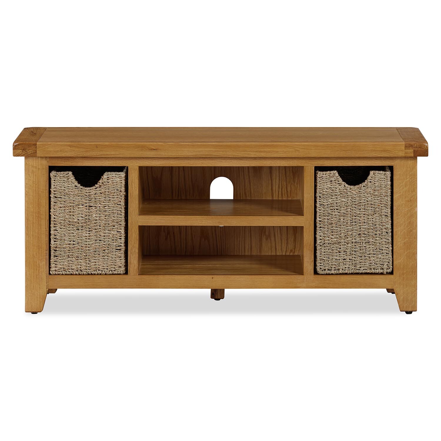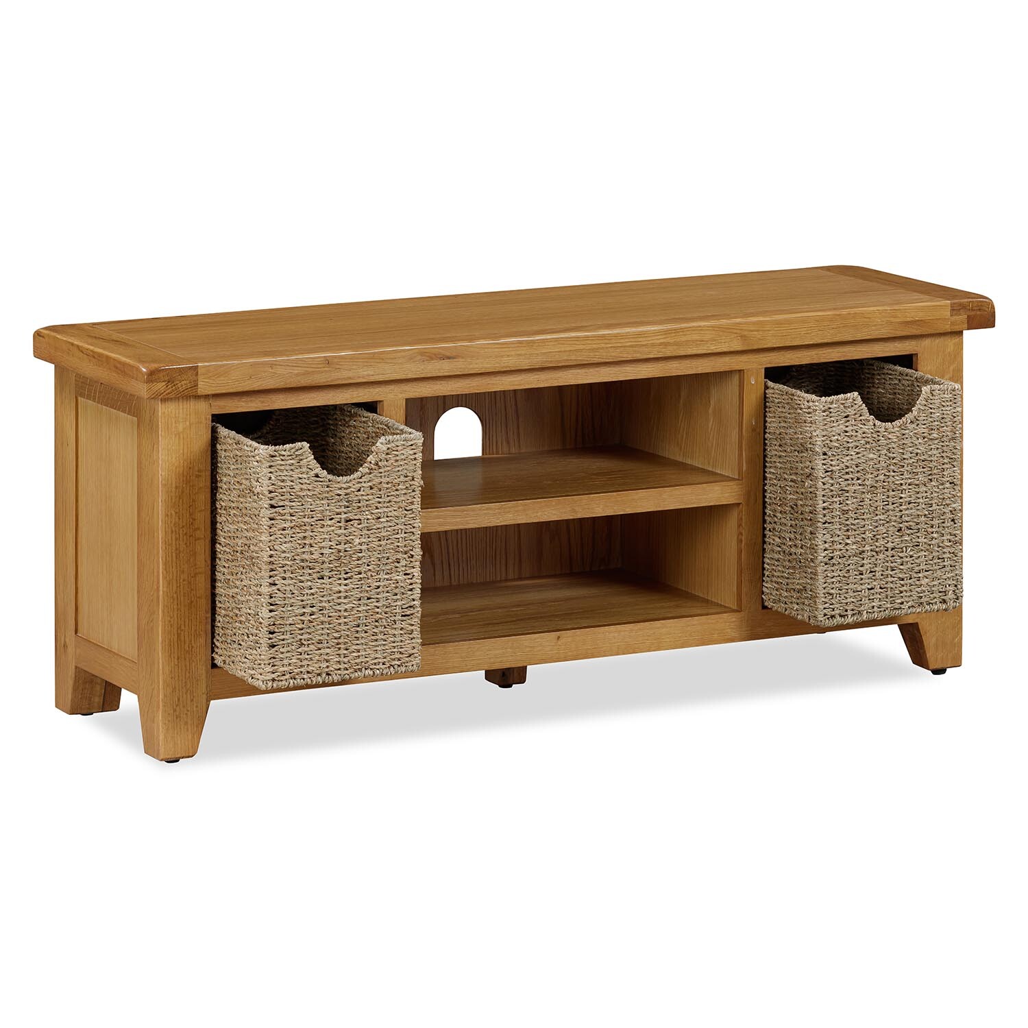 Enhance your living space with the Kinsale TV unit. This charming piece, crafted from solid oak with a natural waxe finish, offers both style and practicality. Two woven sedge baskets provide convenient storage on either side of the sturdy shelves, while a cleverly positioned rear cable hole keeps wires neatly concealed. The rustic baskets add a vintage touch, complementing a variety of interior styles and coordinating beautifully with other Kinsale furniture.