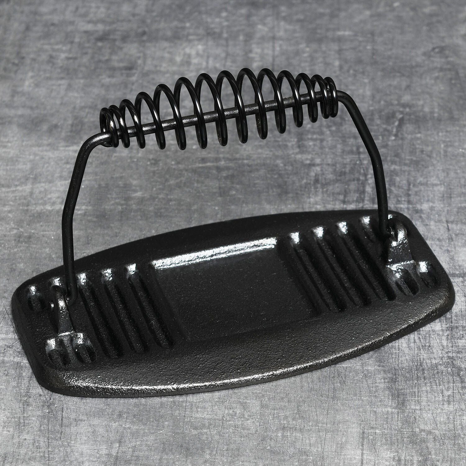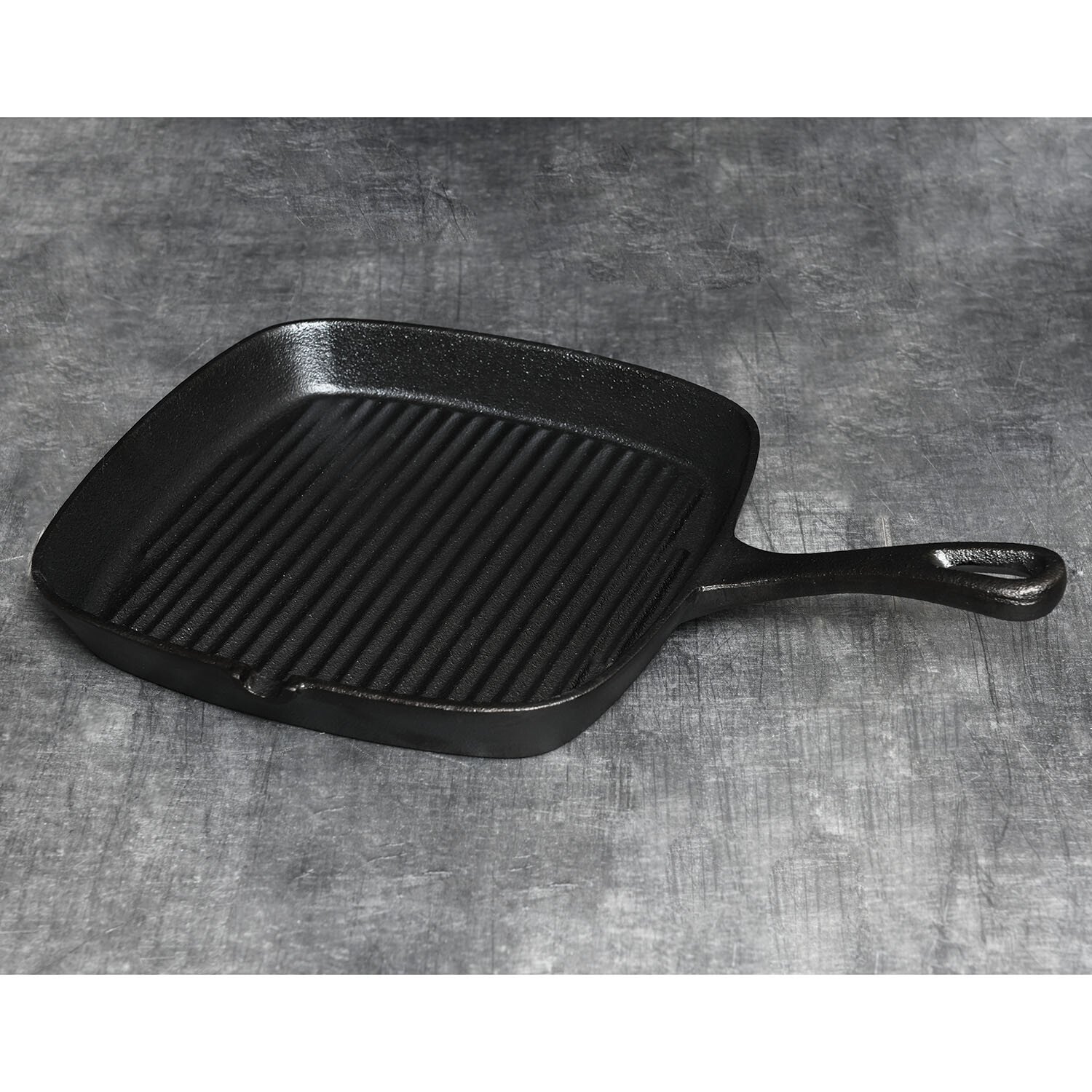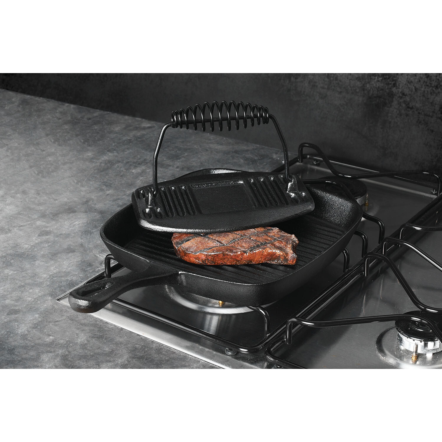 Effortlessly create delicious meals with this square grill pan and meat press. Pre-seasoned with vegetable oil at high temperatures, it boasts a natural, chemical-free cooking surface ready to use straight away. The ridged design helps drain away excess fat and juices, easily poured off via the convenient lip. Perfect grill marks are guaranteed thanks to the meat press, ensuring even contact between food and pan for superior searing.