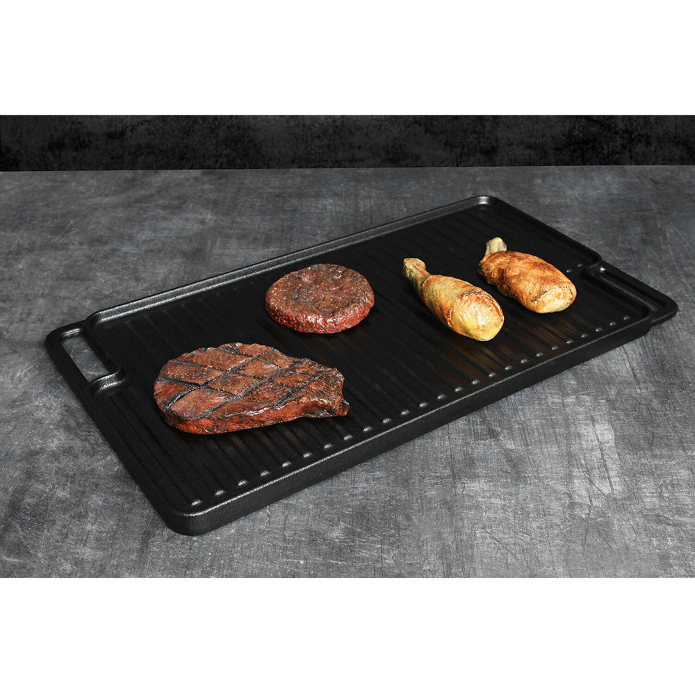 Elevate your grilling game with the KM Griddle Plate. Made from durable cast iron, this griddle is built to last, a heirloom-quality piece you’ll cherish for years. Its reversible design offers ultimate versatility: a ridged side for perfect sear marks and efficient fat draining, and a smooth side ideal for delicate foods like fish and eggs. Pre-seasoned with a high-temperature baked-on vegetable oil coating, it’s ready to use straight away.
