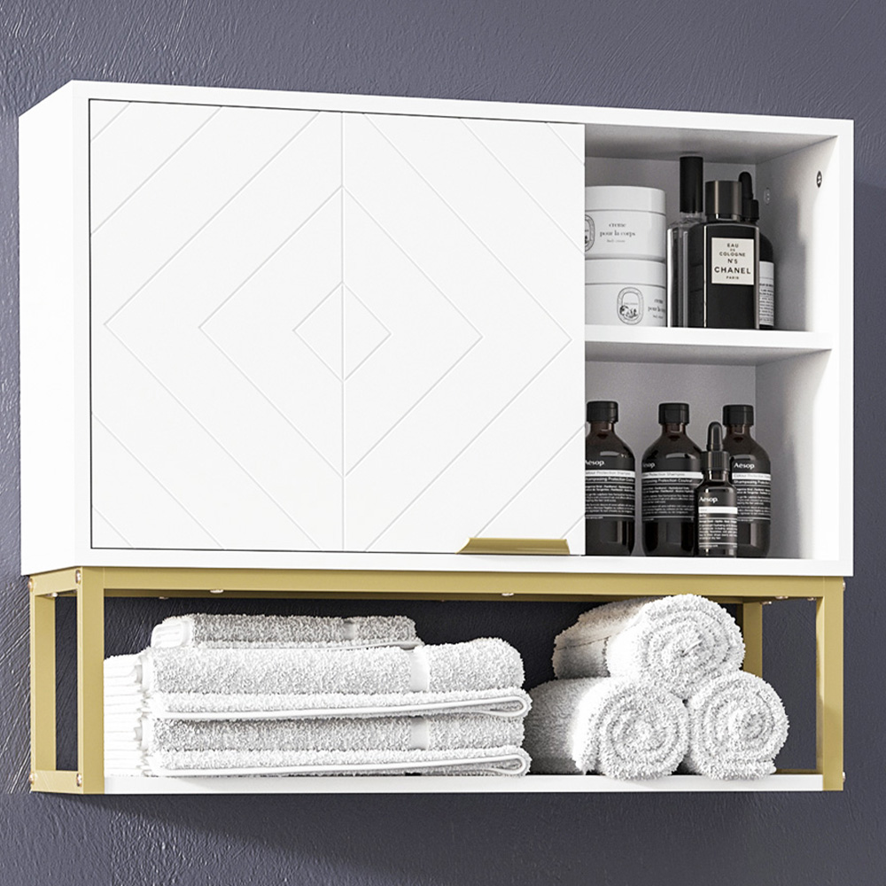 Store bathroom essentials in style with this do it with this Kleankin White Bathroom Wall Cabinet. It comes with a main cabinet with an adjustable shelf, two side shelves and a bottom shelf, providing room for the whole household. The wall-mounted design is space-saving and makes it easy to access too. A Clean white structure, with embossed doors for gentle character, is finished with a gold-coloured bottom for chic points.
