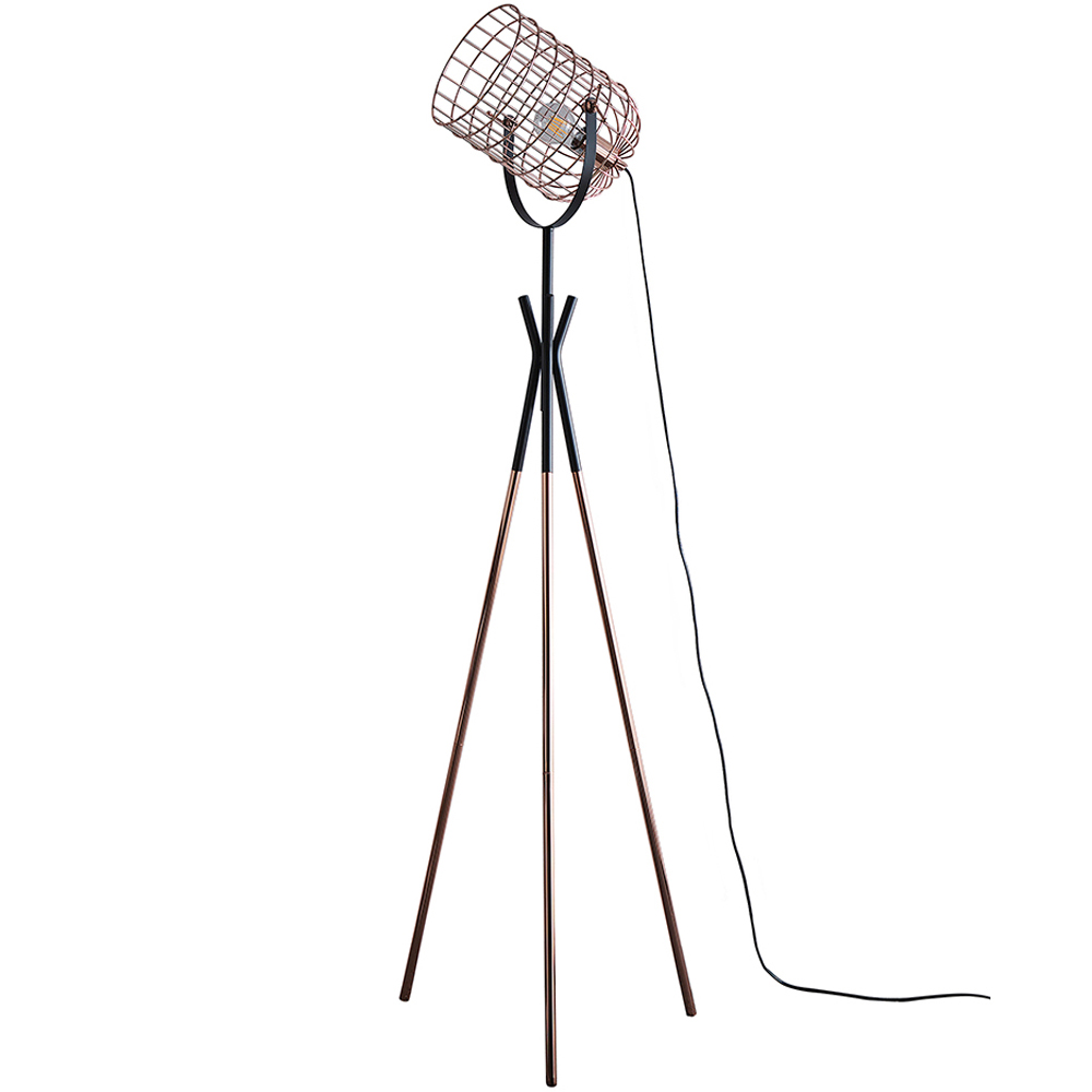 The Fulton Tripod Lamp presents a striking industrial aesthetic, perfect for adding a unique touch to your home. This lamp features a distinctive metal cage design, finished in polished copper and black, ideally suited to contemporary interiors. The caged head securely houses the bulb, creating a minimalist and modern appearance that enhances any room.