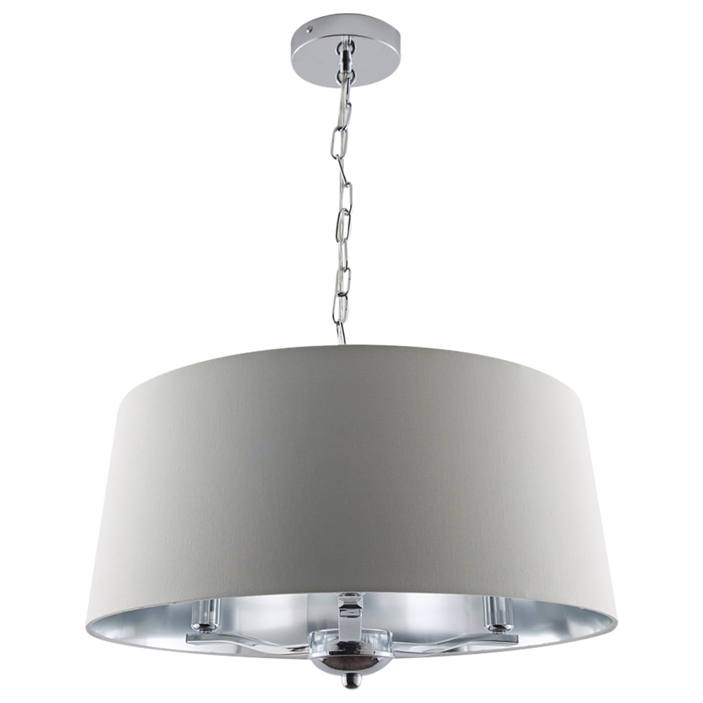 Introduce a touch of elegance to your home with this striking three-light drum chandelier. This statement piece features a cylindrical drum shade, encasing three lights, finished in a polished silver that exudes timeless charm. Designed for versatility, this chandelier is fully dimmable and adaptable for use on sloped ceilings. Requires bulbs (not included): 40 Watt Max, or 10 Watt Max LED. Shade dimensions are approximately: Diameter: 50cm, Height: 21.5cm.