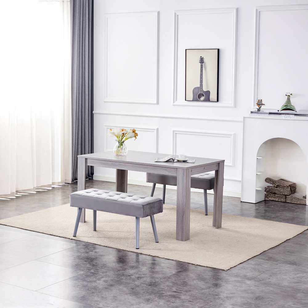 Introduce a touch of elegance to your dining area with the Kosy Koala Dining Table set, complete with two matching benches. The table showcases a sophisticated arrow grey design, expertly crafted from premium MDF with a durable melamine laminated finish. Complementing the table are the grey velvet dining benches, featuring sumptuously soft, padded seats adorned with stylish stitching and tufting. Designed for convenience, clear and straightforward instructions are included to ensure easy assembly. This dining set comprises a table and two high-quality benches. The table's adjustable foot protectors prevent floor damage. Table dimensions: H75 x L140 x W80 cm. Bench dimensions: 90cm (L) x 36cm (W) x 47cm (H).