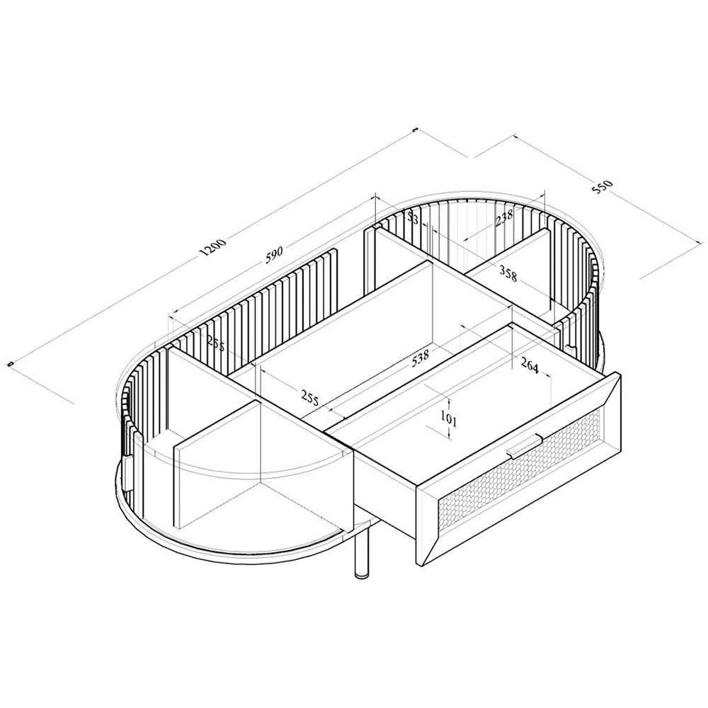 This light oak coffee table from the Kudl collection adds classic luxury to your living room. Its oval shape and artificial rattan detailing create a vintage-modern aesthetic. Space-saving rounded corners and effortlessly sliding curved doors offer both style and practicality. The single drawer adds extra storage, completing this beautiful and functional piece.