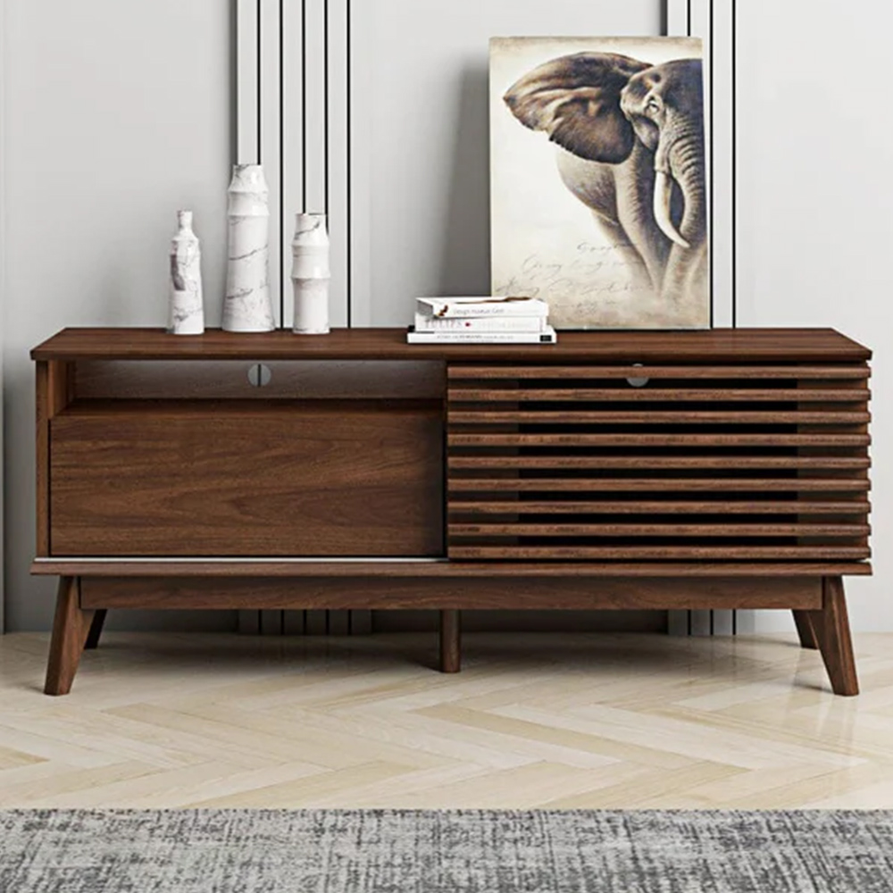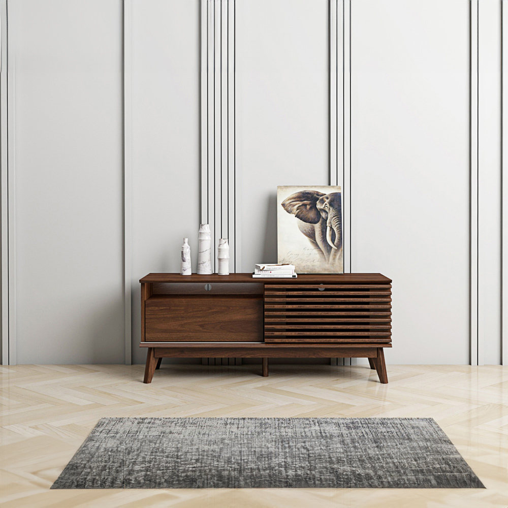 Exquisitely crafted, the LV41 range adds a touch of charm to your home décor. Its minimalist yet vintage design is beautifully realised in a rich Columbian Walnut finish, exuding sophistication and grandeur. The TV unit features a sliding slatted door, cleverly blending organic aesthetics with practical functionality for a harmonious union of style and utility.