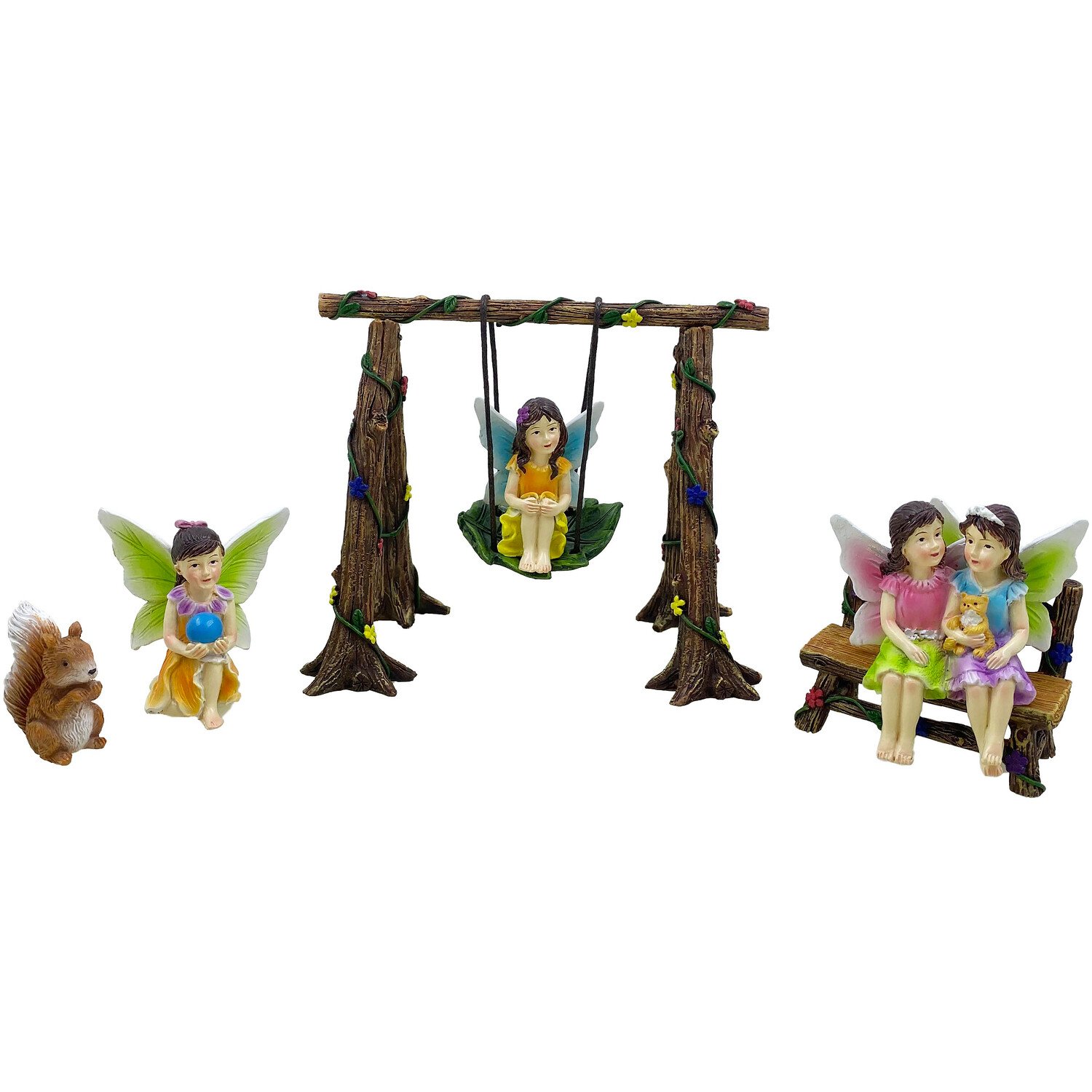 Add an enchanting touch to your garden with this large fairy set. These charming ornaments, featuring intricately detailed fairies with beautiful wings, hair, and dresses, will transform your outdoor space. An adorable squirrel friend completes this whimsical collection.