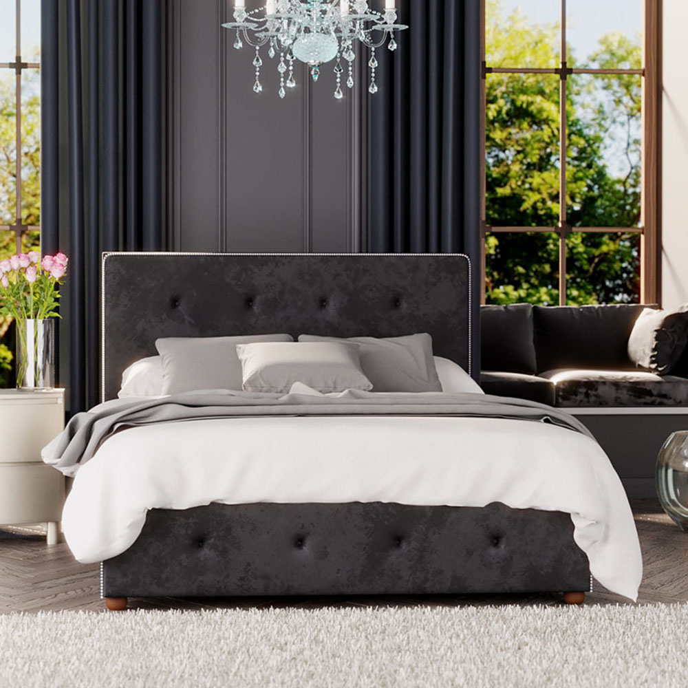 Introduce a touch of opulence to your bedroom with the Laurence Llewelyn-Bowen Hesper Ottoman Bed. This striking single bed, cloaked in a sophisticated black hue, seamlessly blends comfort with exceptional design. The handcrafted ottoman boasts a buttoned design, accentuated with silver stud detailing on both the headboard and footboard, ensuring it stands out. Sumptuous velvet fabric upholstery elevates this ottoman bed, imparting a luxurious feel to any bedroom setting. Built to endure, this robust bed features premium panels and sprung slats, extending the life of your mattress. Accessing the concealed storage is effortless, thanks to the easy-lift mechanism supported by high-quality gas pistons that keep the bed raised. The storage area is lined with a fabric base to protect your stored items. Thick foam padding ensures superior comfort when sitting up, while hand-turned hardwood feet complete the look, effortlessly complementing both modern and classic interior styles.