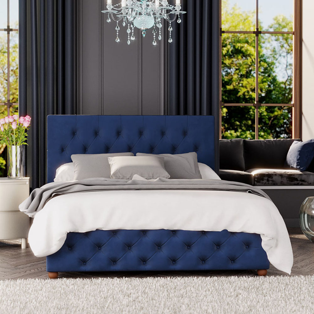 Introduce comfort and practicality to your bedroom with the Laurence Llewelyn-Bowen Luna Ottoman Bed. This small double bed, finished in navy, showcases a hand-tufted, diamond-scoring design across both the headboard and footboard, complemented by generous foam padding. The headboard provides excellent support for reading or relaxing in bed. Constructed with robust, upholstered panels and quality sprung slats, the Luna velvet bed enhances both comfort and mattress longevity. Each Ottoman bed is distinguished by hand-turned and varnished hardwood feet. Addressing the demands of contemporary living, this bed provides an ideal storage solution for space-challenged rooms, or simply offers extra storage for those who require it. Effortless access to the concealed storage within the Luna bed frame is ensured by easy-lift gas pistons, which also enable hands-free operation once elevated. The bed's top section remains securely in the raised position. A fabric base is attached to the underside of the bed, safeguarding stored items. Please note that delivery of this bed is restricted to within the UK.