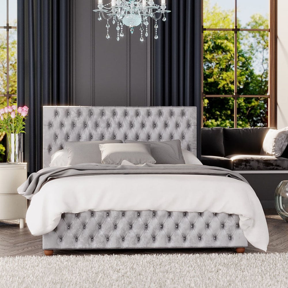 Introduce a touch of opulence to your sleeping space with the Laurence Llewelyn-Bowen Seren Silver Mirazzi Velvet Ottoman Bed. Skillfully handcrafted and fully upholstered, this bed embodies British craftsmanship with an undeniably classy aesthetic. The headboard and footboard showcase a sophisticated Chesterfield scoring design, instantly elevating your room with a glamorous, boutique hotel vibe.