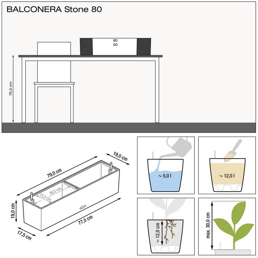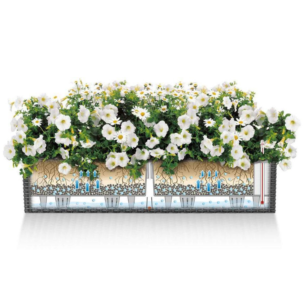 Elevate your indoor or outdoor spaces with the Lechuza Balconera Colour 80 Graphite Black self-watering planter. This versatile planter, perfect for tables, hanging baskets, or windowsills, boasts a sophisticated matte finish and superior durability thanks to its UV and frost resistance. The included removable pot liner and water level indicator simplify plant care. Its intelligent self-watering system, complete with pure mineral plant substrate and fertilizer, provides consistent hydration and nourishment for 2-12 weeks (depending on size). For optimal plant adaptation, top water for the initial 10-12 weeks, thereafter, simply refill the reservoir as needed. The planter offers a 12L capacity (internal dimensions: H19 x L79 x W19cm), though the self-watering system will slightly reduce the available planting space.