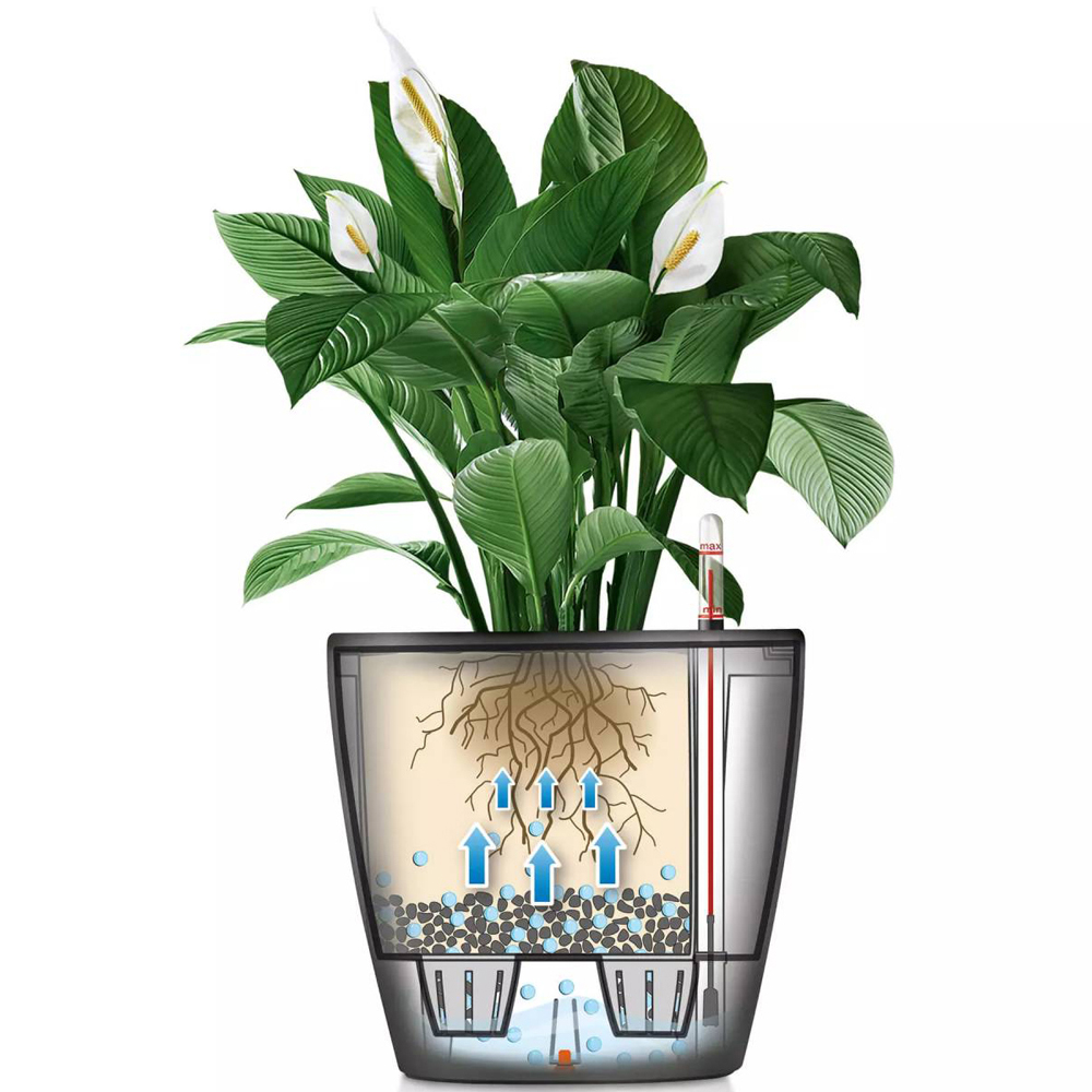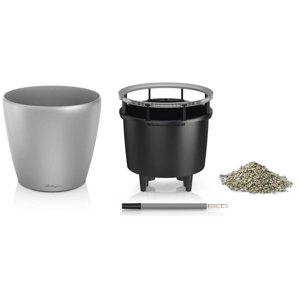 Elevate your outdoor space with the Lechuza Classico 35 LS Silver planter. This German-engineered, 33cm high planter offers lasting style and effortless plant care. Crafted from durable, fade-proof, and impact-resistant poly-resin plastic, its silver matte finish adds a contemporary touch. The self-watering system, featuring a reservoir, inner and outer pot, water level indicator, and drain plug, simplifies watering – providing plants with water and fertilizer for 2-12 weeks (depending on size). Initial top watering (10-12 weeks) helps plants adjust. Note: Internal dimensions exclude the self-watering system, slightly reducing planting space. Enjoy healthy, happy plants with less effort.