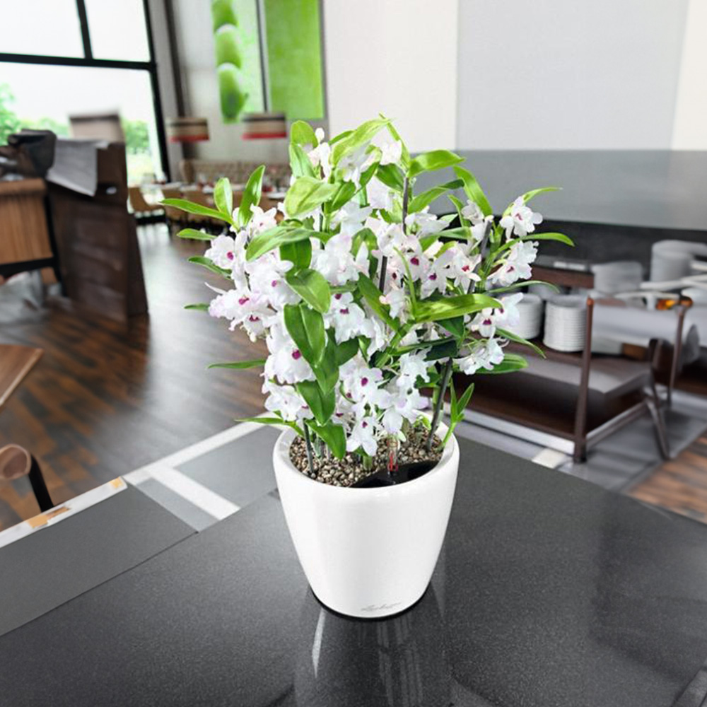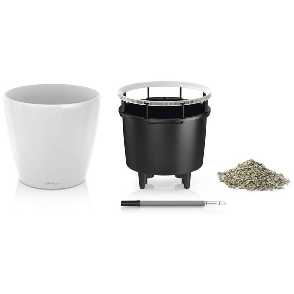 Elevate your garden with the Lechuza Classico 35 LS—a self-watering planter that's as stylish as it is practical. Crafted in Germany from durable, fade-proof, and impact-resistant poly-resin plastic, this cream white glossy planter offers a contemporary touch. Standing at 33cm tall, it features a built-in reservoir and sub-irrigation system to keep your plants thriving for 2-12 weeks (depending on size) with minimal effort. The included indicator monitors water levels, while a drain plug prevents overwatering. For optimal results, top water for the first 10-12 weeks to help your plant acclimate. Afterward, simply refill the reservoir. The planter provides sufficient water and fertilizers. Note: the internal dimensions exclude the self-watering system, slightly reducing planting space. This planter includes an inner pot, outer pot, and drain plug. It can survive freezing temperatures. Enjoy less watering and healthier plants all year round.