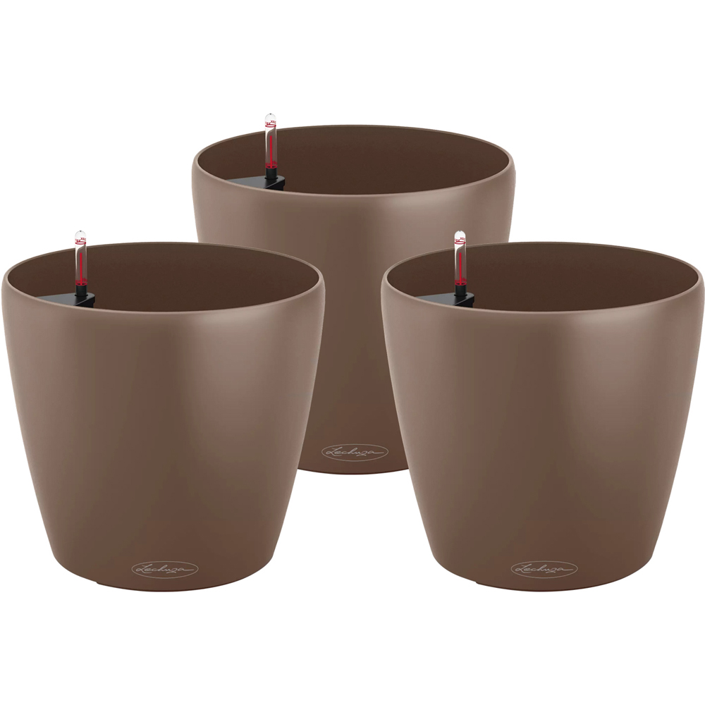 Upgrade your outdoor space with the Lechuza Classico Nutmeg planter – a 3-pack of 19cm self-watering pots perfect for patios, poolsides, or porches. Its matte finish delivers a modern aesthetic, while the UV and frost resistance ensures lasting use, both indoors and out. Each planter includes a removable separator, a water level indicator, a drainage hole, and mineral plant substrate for optimal growth. The intelligent self-watering system provides water and fertilizer for 2-12 weeks (depending on size), minimizing maintenance. For the first 10-12 weeks, top water to help your plants adjust. Afterwards, simply fill the reservoir – your plants will draw water as needed.
