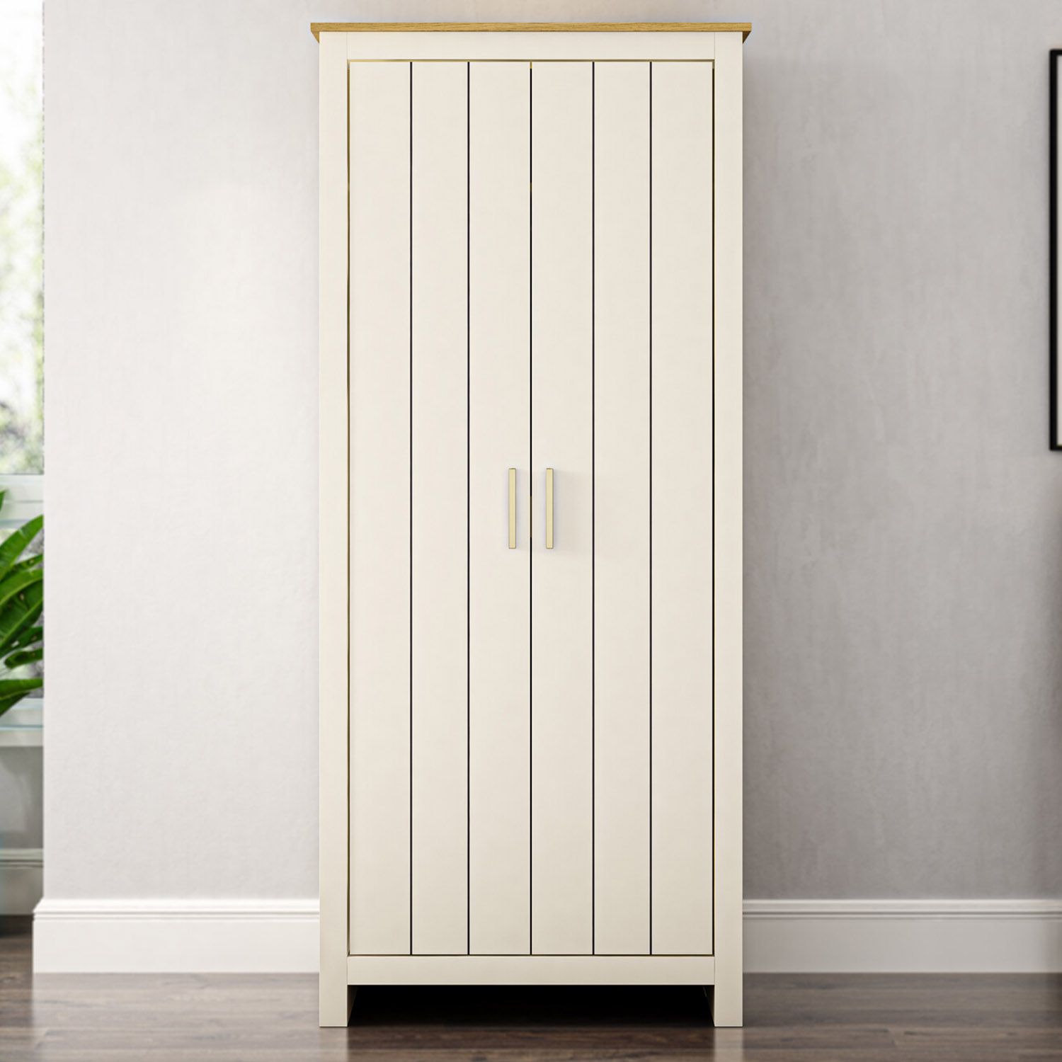 This stylish two-door wardrobe offers a chic solution for organised clothing storage. Finished with a sophisticated oak veneer top and a contemporary country design, it complements a variety of interior styles. The sleek handles and beautiful design make it a welcome addition to any bedroom.