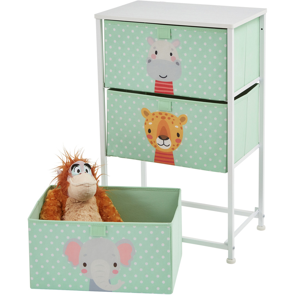 This Jungle-themed 3-Drawer Storage Chest is the playful solution to your child's clutter. Featuring adorable animal characters, each drawer offers ample storage space, secured with a firm base and backstop. Crafted from breathable, soft non-woven fabric drawers and a sturdy MDF top, this chest boasts a patented white steel frame with adjustable feet for stability on uneven floors. Perfect for keeping toys, clothes, and more organised. Suitable for ages 2+. Overall dimensions: H730 x W450 x D300mm. Drawer dimensions: H190 x W400 x D290mm.