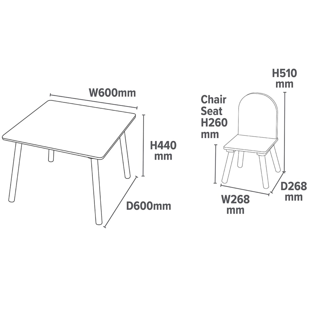 Crafted with durability in mind, the table top is made from sturdy wood, supported by solid pine wood legs, ensuring stability and withstanding the energy of playtime. Pinewood is known for its impact resistance. The pinewood legs are finished with a hardwearing vinyl wrap for extra protection, and all corners are thoughtfully rounded for enhanced safety and comfort.