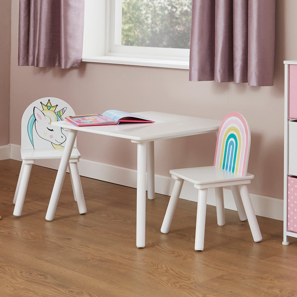 Bring a touch of magic to your little one's room with the Liberty House Toys Unicorn Table and Chairs Set. This delightful set features a crisp white table accompanied by two charming chairs. One chair showcases a beautiful unicorn design, while the other boasts a vibrant rainbow, creating an enchanting space for children to play, read, draw, write, or even enjoy a snack.