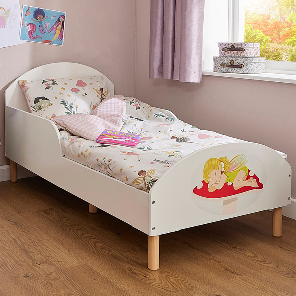 Give your toddler the sweetest dreams in the Liberty House Toys Kids Toddler White Fairy Bed. This charming bed features an enclosed top frame and a modern, rounded headboard, offering a comforting transition from a cot. The raised sides ensure safety, preventing accidental falls, while the low-to-the-ground design makes getting in and out easy. Crafted from a strong wooden frame and sturdy round pinewood legs, this bed is built to last. Its all-white finish allows for easy accessorizing with your child's favourite bedding (sold separately). A digitally printed sleepy fairy decal is included to complete the magical fairy-themed bedroom. Mattress not included. Size: 75 x 144cm.