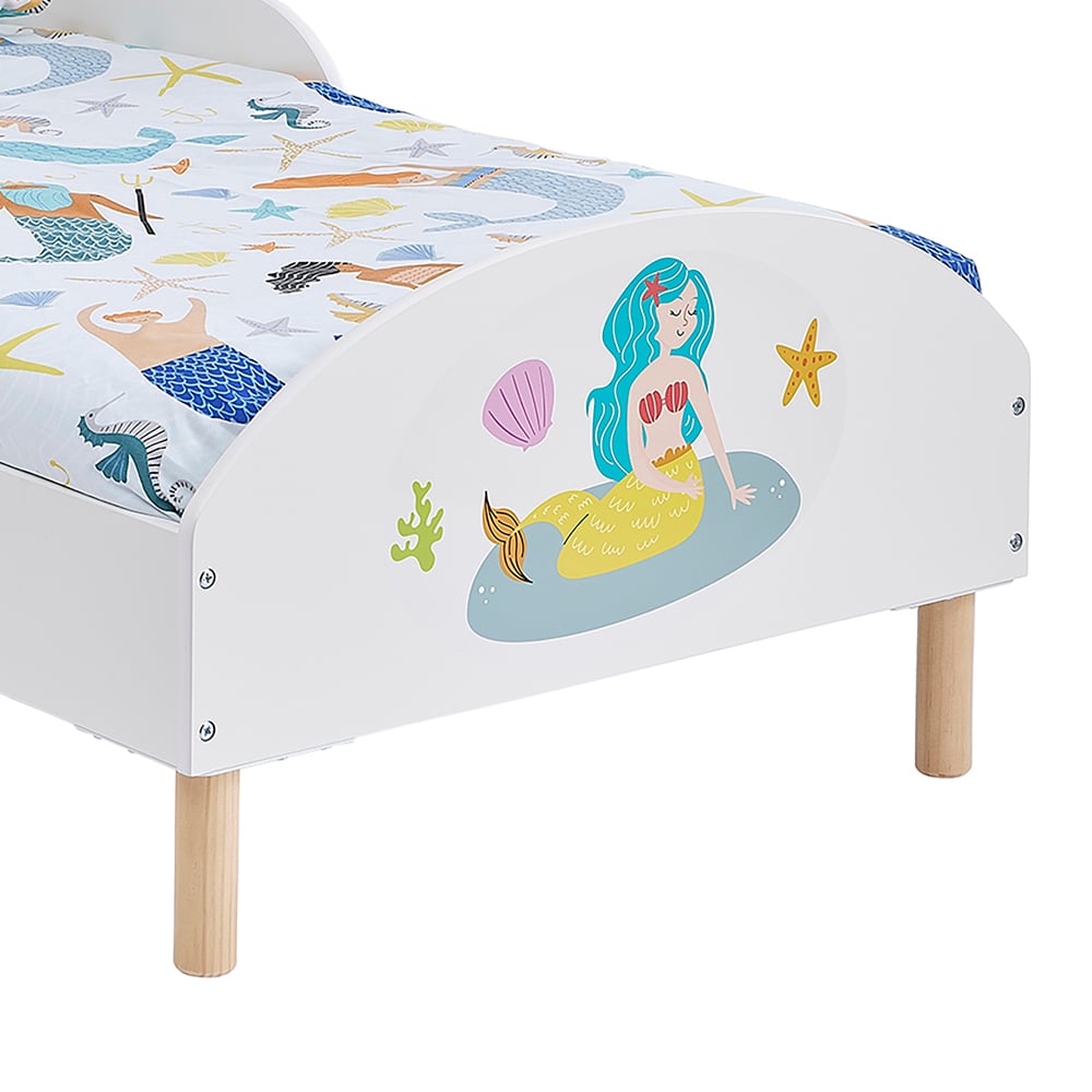 Introducing the Kids Toddler White Mermaid Bed. This charming bed features an enclosed top frame and a modern rounded headboard, creating a safe and comforting space for your little one's transition to a bigger bed. The raised sides provide added safety, preventing accidental falls, while the low-to-the-ground design makes getting in and out easy. Crafted with a strong wood frame and sturdy round pinewood legs, this bed is built to last. The all-white finish allows for effortless accessorizing with your choice of bedding to complete your mermaid-themed haven. A delightful digitally printed mermaid decal is included. Bedding and mattress sold separately. Size: 75 x 144cm.