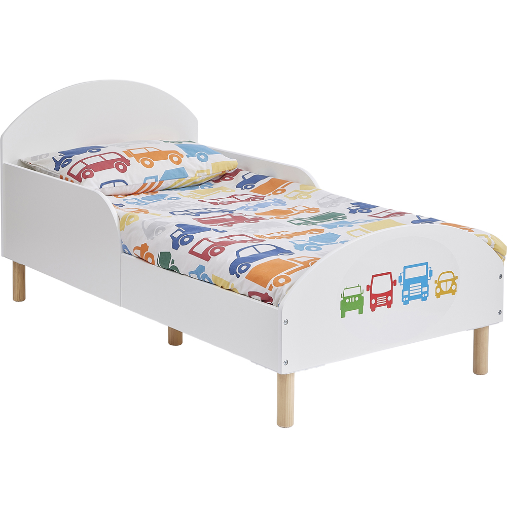 It's time for your toddler's big sleep upgrade! This white wooden bed, featuring an enclosed top frame and a modern rounded headboard, offers a comforting transition from cot to bed. The raised sides provide safe boundaries, preventing accidental falls, while the low-to-the-ground design makes getting in and out easy. Crafted with a strong wood frame and sturdy round pinewood legs, this bed is built to last. The all-white finish allows for effortless customization with your choice of bedding. A fun transport decal is included to complete the look. Perfect for a transport-themed bedroom! (75 x 144cm). Bedding and mattress sold separately.