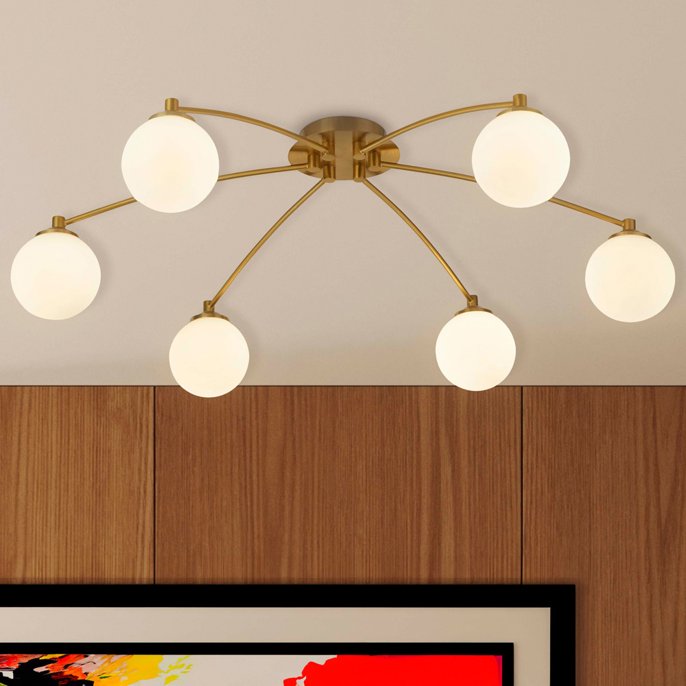 Illuminate your home with understated elegance using this five-light semi-flush ceiling fitting. Featuring opal glass shades that diffuse a warm, inviting light, this piece combines sleek brass arms and frame for a contemporary feel that complements diverse interior styles. Its clean lines and neutral design ensure it enhances rather than overwhelms your existing décor, adding a touch of sophistication without fuss. Simply install your preferred LED bulbs (not included) and enjoy effortlessly stylish illumination.