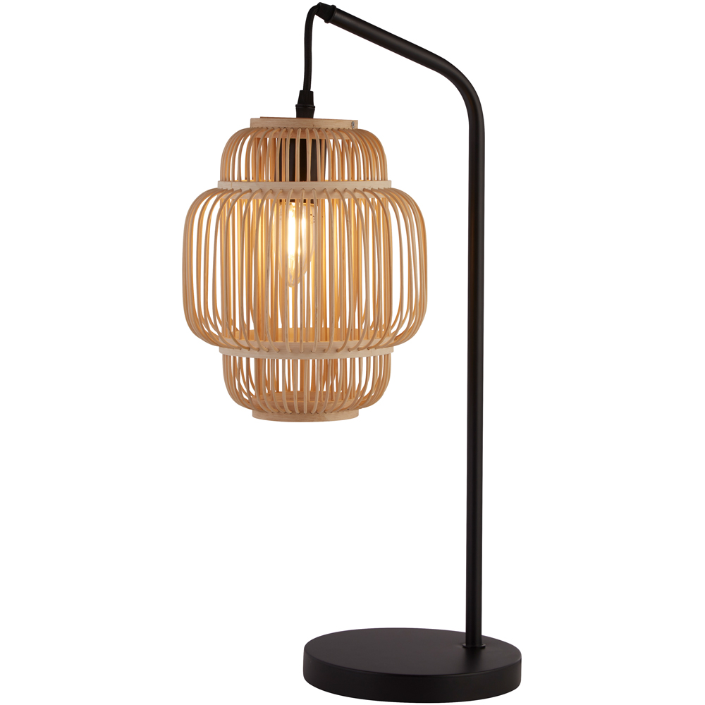 A stylish table lamp, blending modern design with organic charm. Its bamboo shade, elegantly suspended from a curved black metal arm, introduces a natural warmth to any room. Standing at a height of 55cm, it's perfectly sized for side tables, bedside cabinets, or console areas. Simply add a GLS LED bulb; an inline switch provides effortless control. The bamboo's texture and subtle warmth create a relaxed yet sophisticated ambience, adding a touch of nature-inspired elegance to your home without being overpowering.