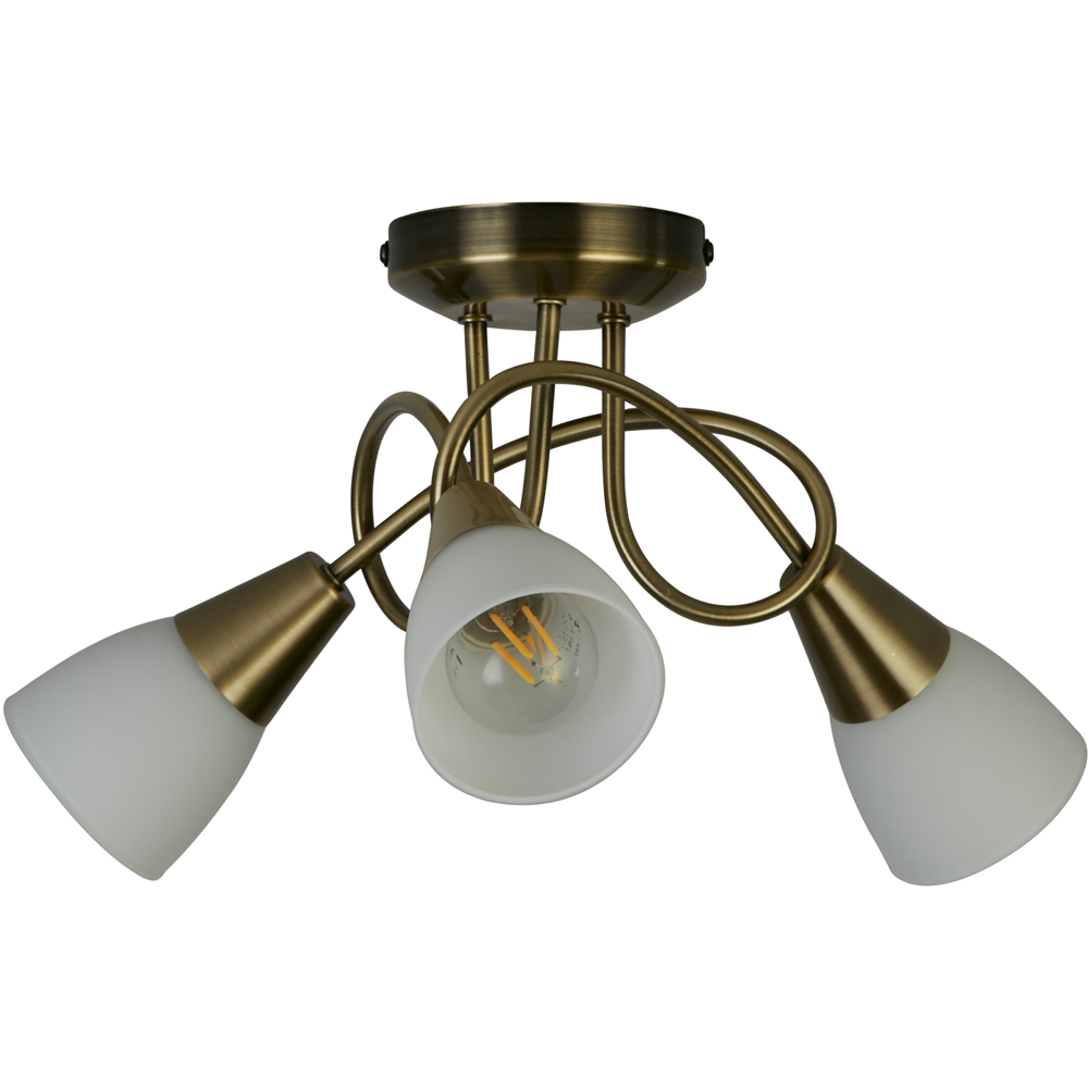 This elegant ceiling light features three white glass shades, casting a soft, even glow throughout your space. The antique brass twisted arms add a touch of timeless style, perfectly complementing any room's décor. Energy efficiency is ensured with its use of three E14 golf ball LED bulbs (bulbs not included). Create a warm and inviting ambiance in your living room or dining area.